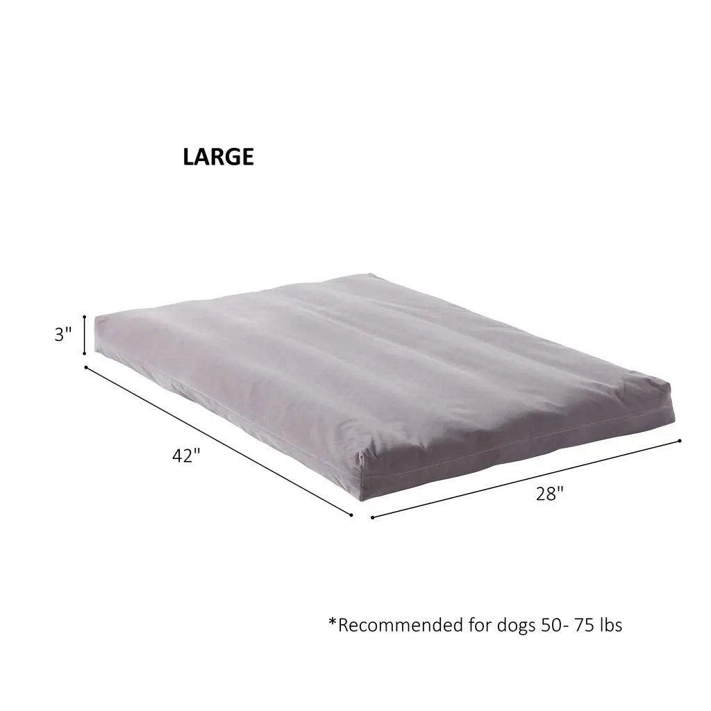 The Happy Hounds' Cooper Deluxe Crate pad is designed to make your dog's crate time as comfortable as possible. The super soft microfiber fabric is both water and stain resistant, as well as machine washable for easy care. This reversible cushion was designed to fit most standard crates, but is plush enough to use as a simple pillow style bed out of the crate as well. The zipper closure allows for easy removal and cleaning of the cover. The channel-filled insert keeps fill in place for a consistent comfort for your pet. Insert is generously filled with a soft polyfiber made from 100% post-consumer recycled plastic. Available in Denim, Gray or Latte colorsHeavy-duty 100% microfiber fabric Water and stain-resistant, recommended for indoor use Removable cover with hidden zipper to prevent chewingFilled with 100% post-consumer recycled plastic poly-fiberfillMachine washable coverFilled and finished in the USAExtra Large bed dimensions: 48"L x 30"W x 3"HLarge bed dimensions: 42"L x 28"W x 3"HMedium bed dimensions: 36"L x 23"W x 3"HSmall bed dimensions: 30"L x 19"W x 3"HExtra Small bed dimensions: 24"L x 18"W x 3"HBed dimensions can be ± 1 inchPlease note: Product will arrive in a slightly compressed state; please allow a few days for product to expand to final size listed in description.