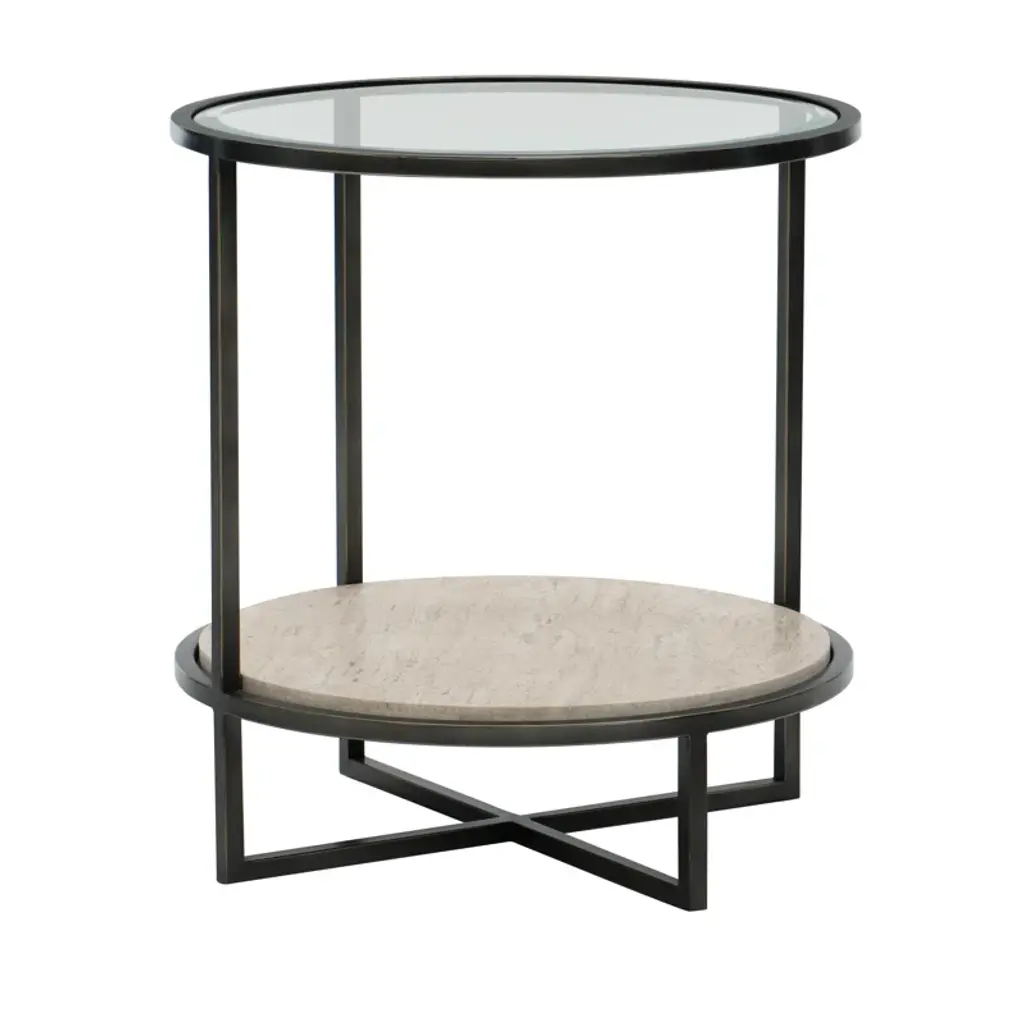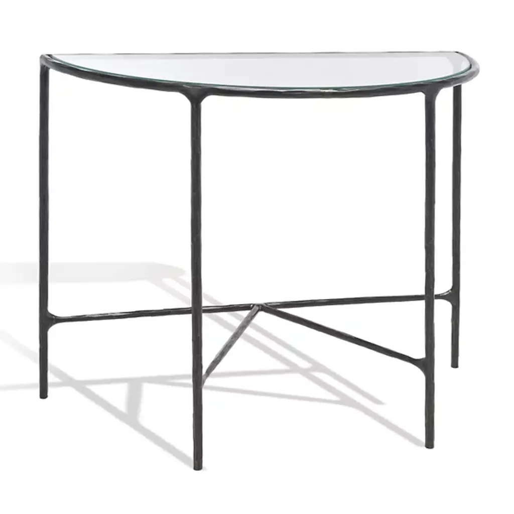 Small in scale but big on beauty, this accent table is expertly handcrafted of steel with a natural iron finish. The slight patina of metal contrasts a sleek glass top, making for an ultra-versatile piece. And because of its open frame and petite size, its a perfect addition to any room where space is at a premium.