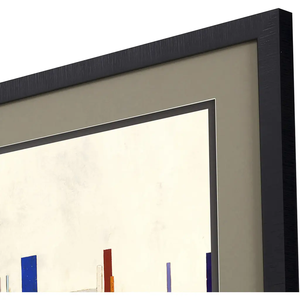 Giclee is hand embossed and float mounted. A moss colored mat is off-set and raised. Framed in a black block contemporary moulding.