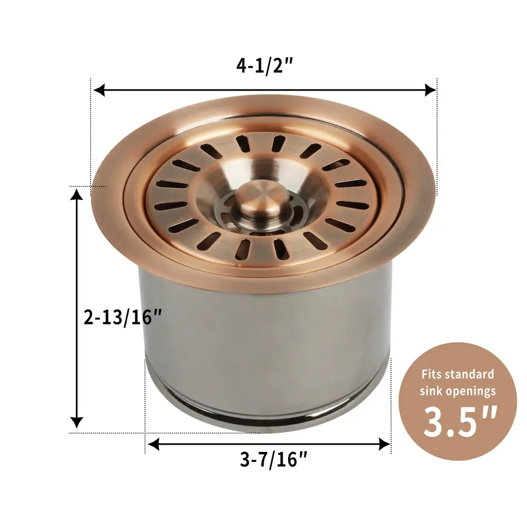 Copper Kitchen Sink Garbage Disposal Flange Stopper, One Size Disposal Rim (2.85" Height) * Premium metal construction is designed for durability * Fits standard garbage disposal units, 4-1/2-Inch diameter, 3-1/2-inch drain hole,2.85-Inch depth. * Hand finished in Antique Copper to look beautiful with Copper sinks * Removable stopper with rubber ring makes cleaning easy * Lifetime Warranty