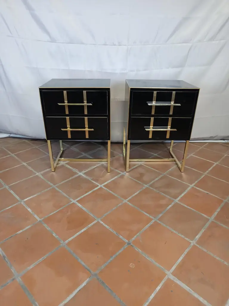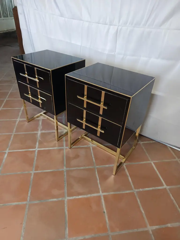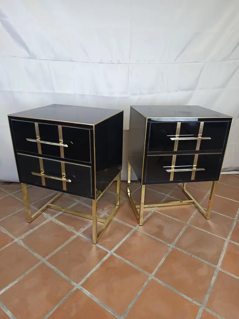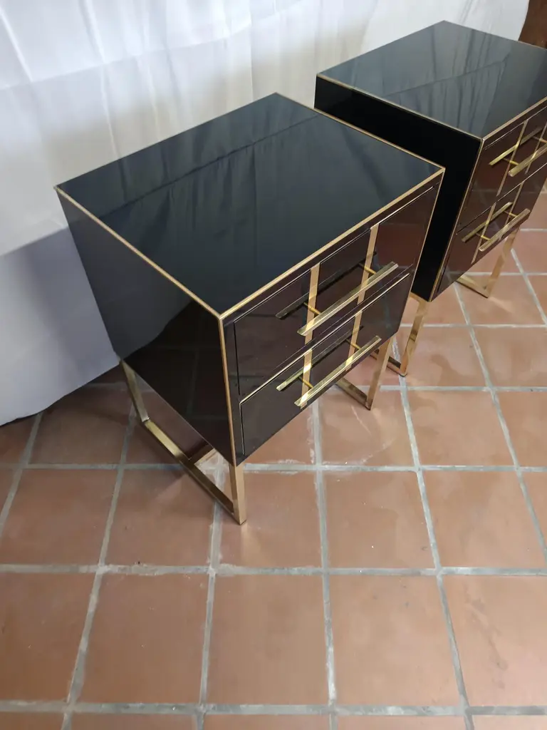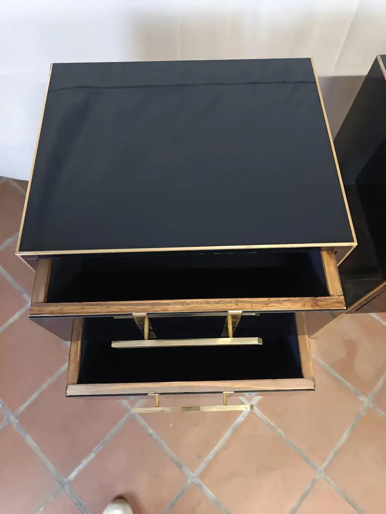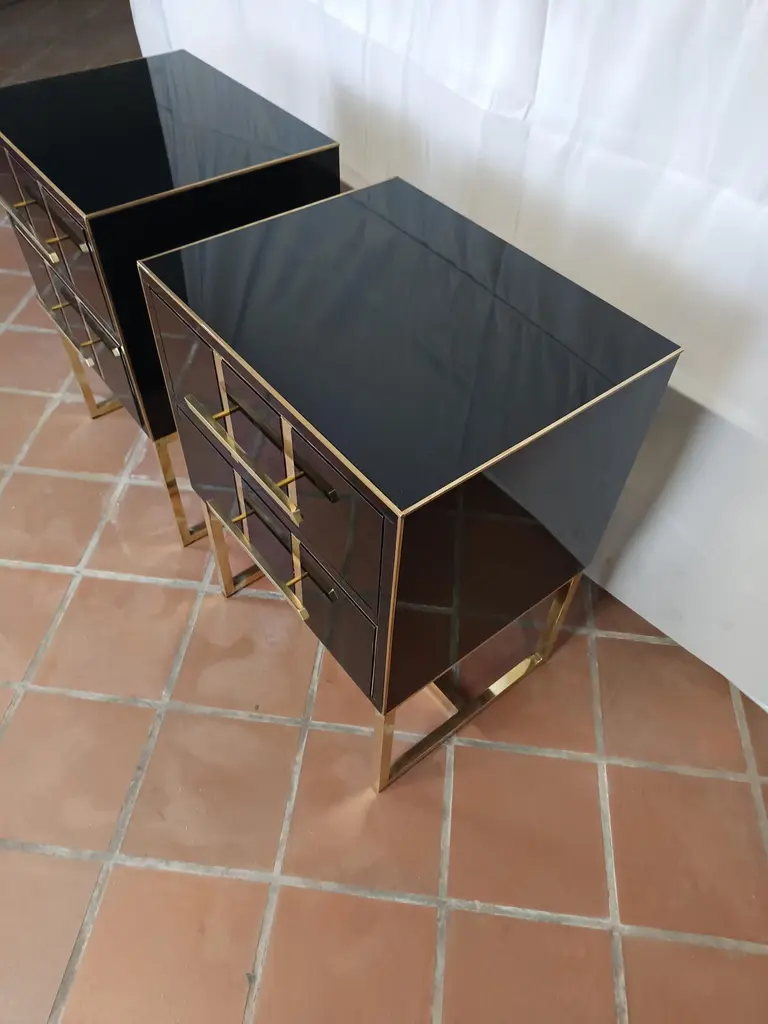 Il comodino con la sua superficie in vetro nero trasmette una sensazione di freschezza e eleganza. Sui suoi lati verticali, sono presenti raffinati dettagli in ottone, che si estendono lungo tutta l'altezza del comodino, conferendo un tocco di lusso e linearità al suo aspetto.Le maniglie tagliate all'estremità sono dei veri gioielli, offrendo un'impugnatura comoda e aggiungendo un tocco di classe. La precisione del taglio e il dettaglio artigianale si fondono armoniosamente con il vetro nero I piedi su misura, realizzati in ottone saldato e lucidato, conferiscono stabilità e creano un collegamento visivo con i dettagli in ottone sulla parte anteriore. Questo comodino è un'opera d'arte funzionale, un mix di estetica sofisticata e praticità, ideale per arricchire qualsiasi spazio.