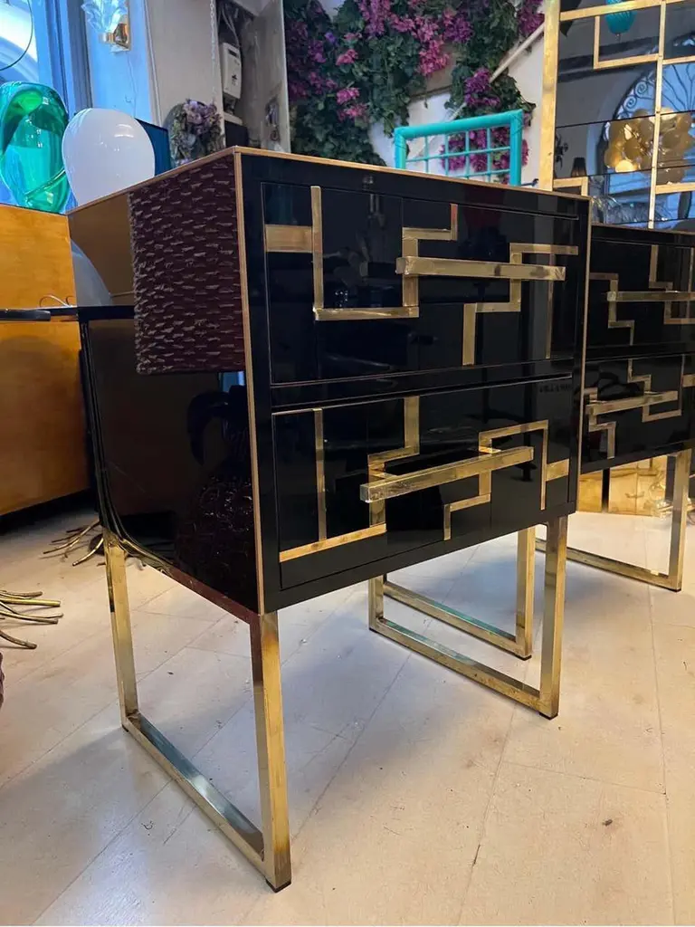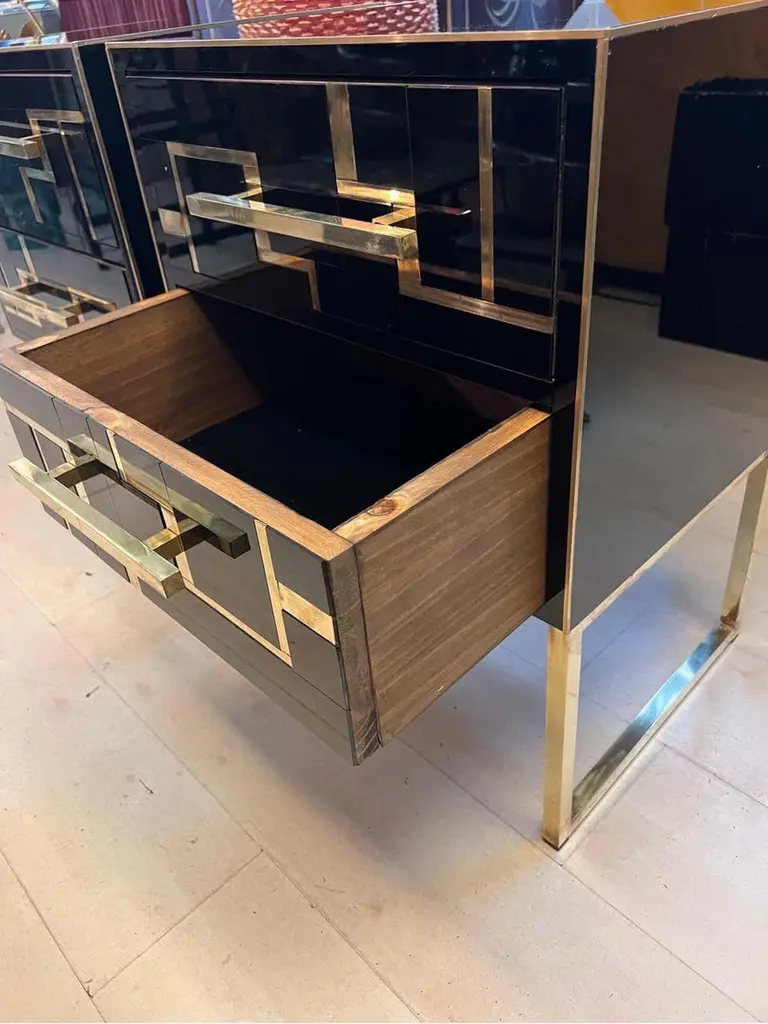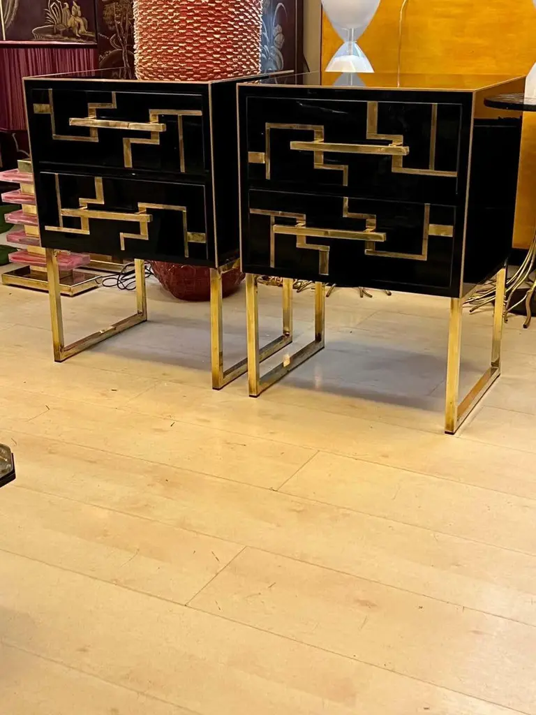 Coppia Comodini Legno, Vetro Nero, Intarsio In Ottone Stile Anni 50