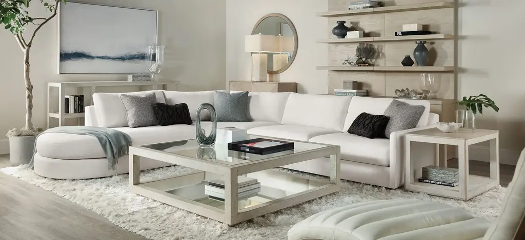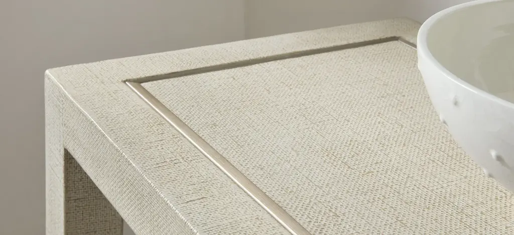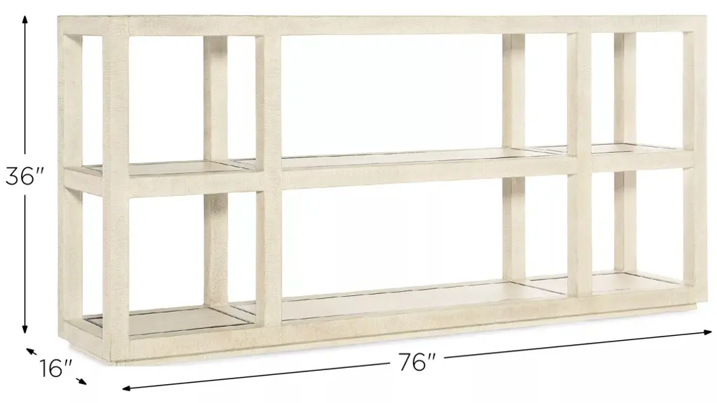 In a serene neutral color palette and crafted in a tactile lacquered burlap finish with a subtle metal inlay with an alluring sparkle, the Cora console table offers cubbie-like storage and display areas to clear your clutter and infuse your space with tranquility. At only 16 inches deep, this piece will fit in tight spaces. One fixed shelf.