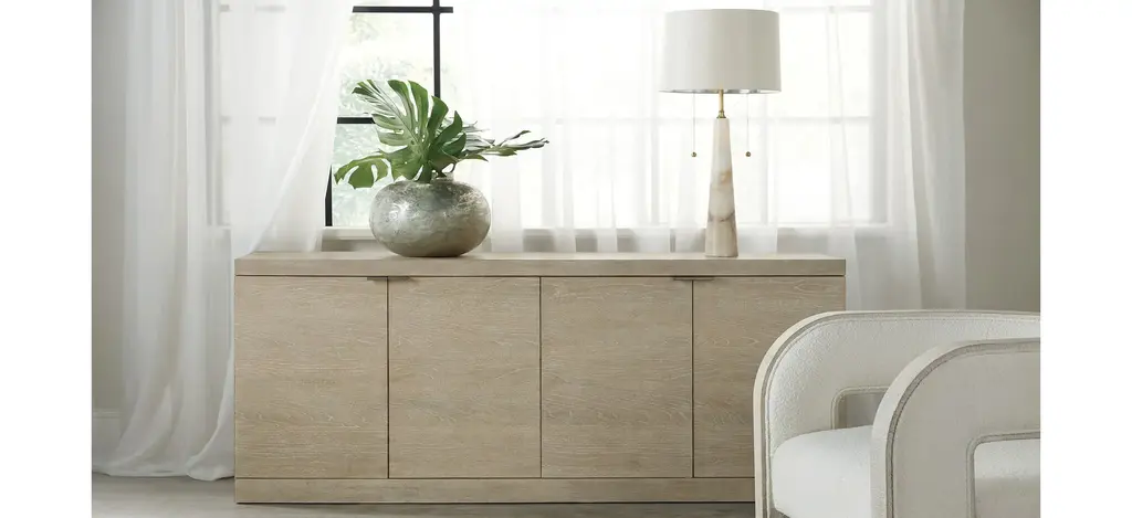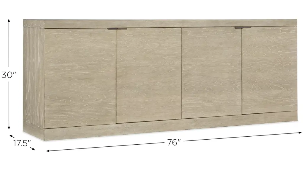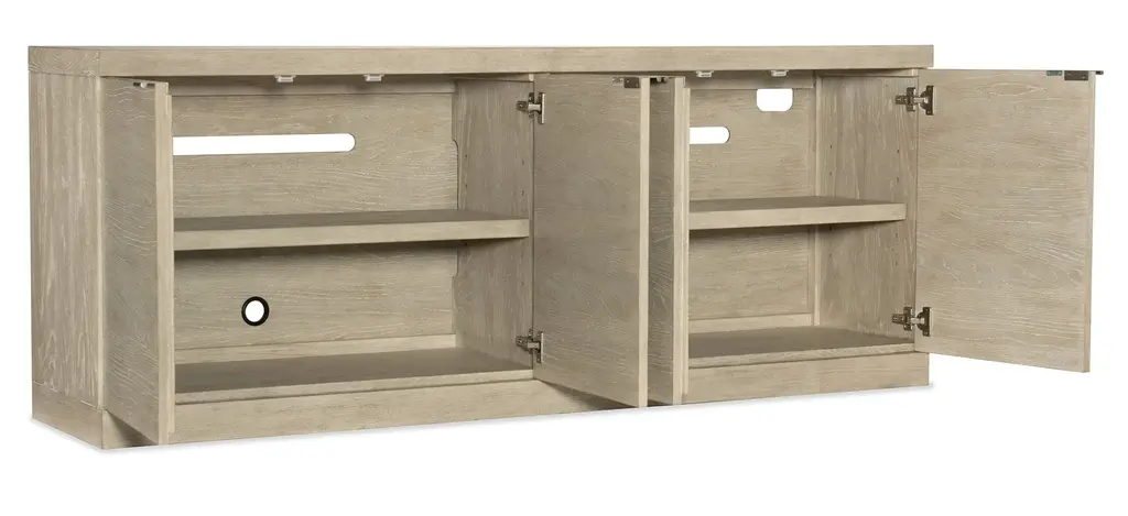 Serene and simple with a soothing neutral color palette, the TV-ready Cora Credenza helps you create a place of retreat in your home where you can slow down and relax. The credenza is finished in Terrain, a soft taupe finish on Oak veneers with dry brushing and accented by champagne-colored tab pull hardware. Four doors with soft-close hinges and one adjustable shelf behind each pair of doors. Theres a ventilated back panel with one FC705 3-plug electrical outlet and levelers. Accommodates up to a 75-inch TV.