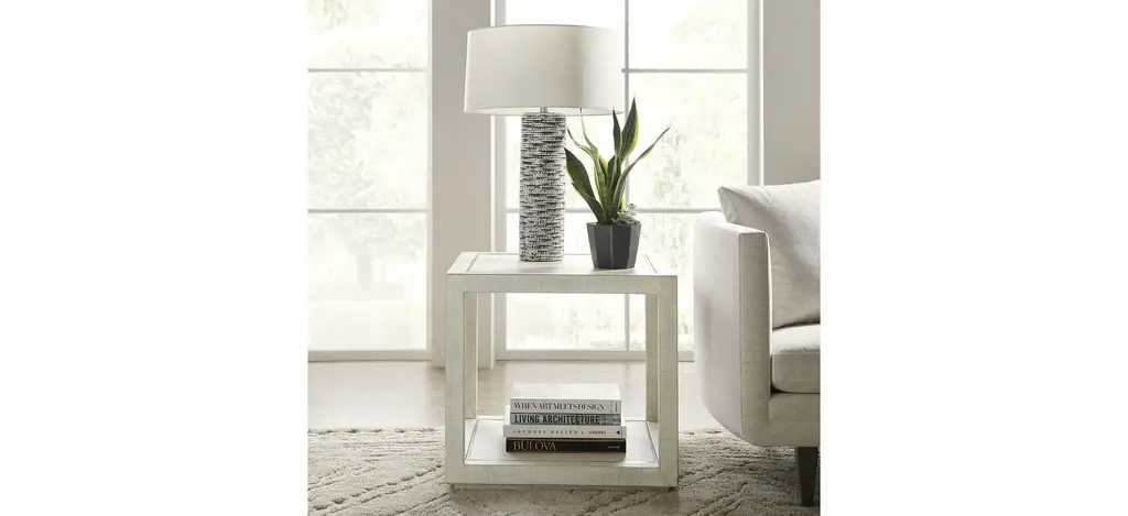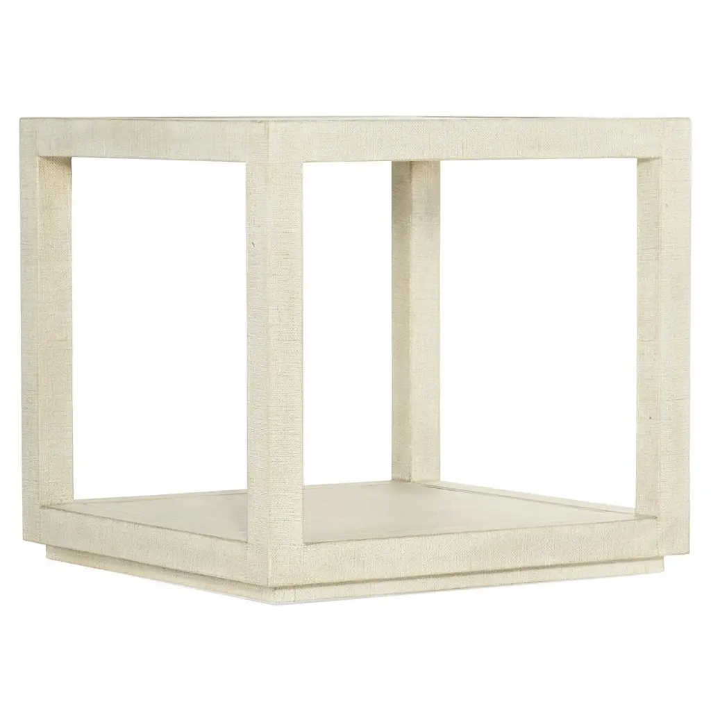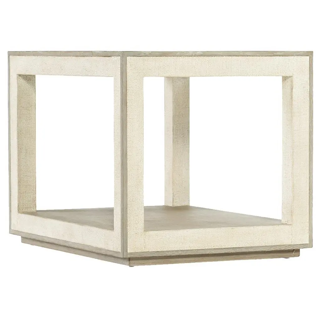 Get your Zen on with the Cora End Table, combining a lacquered burlap finish with an Oak Veneer top accented by metal inlay on in a soft, serene taupe finish. The airy vibe and square shape is a simple, stylish and practical addition to any living space.