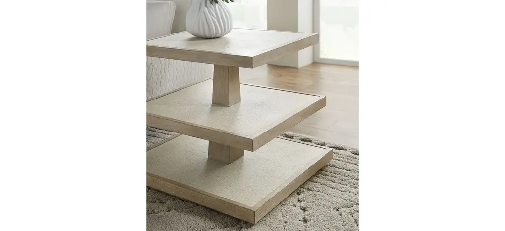 This 3-tiered, square-shaped Cora end table in a soft taupe finish on lacquered burlap and oak veneers with dry-brushing has a tactile texture and organic chic appeal. The tiers can be used as shelves for display or storage.