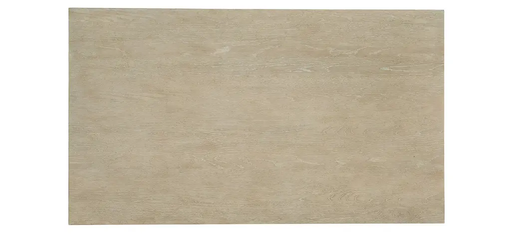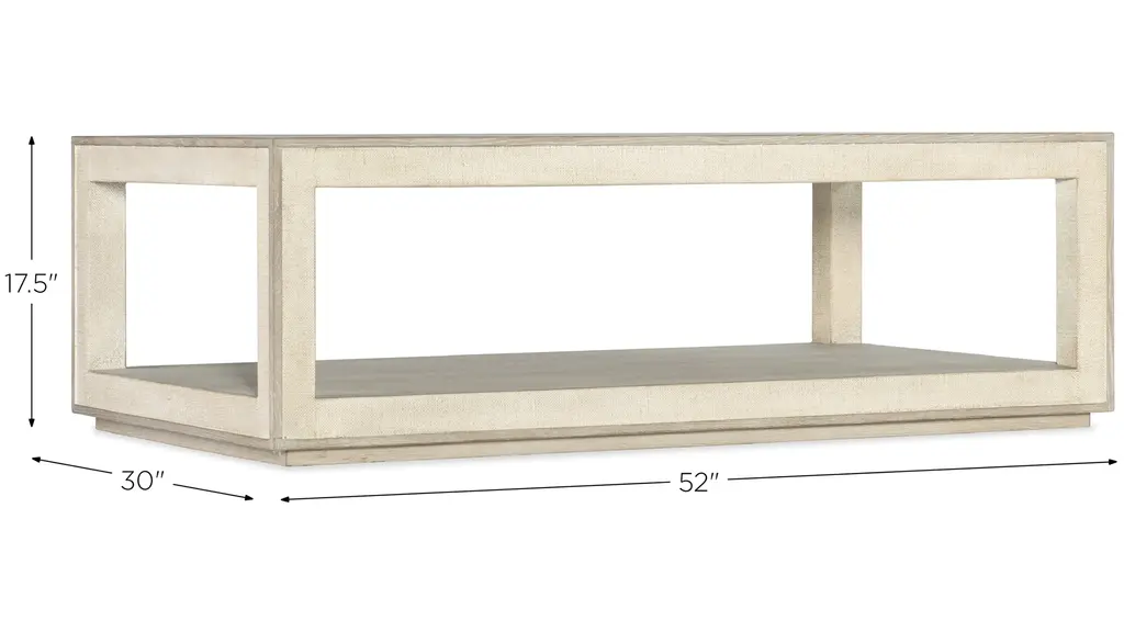 The sleek silhouette of the rectangle-shaped Cora cocktail table combines with a serene neutral color palette to infuse your living space with a relaxing tranquility. Crafted of Oak Veneers with a lacquered burlap finish in a pebble color with a wood top and trim in a soft taupe, this roomy table features castors for easy mobility.