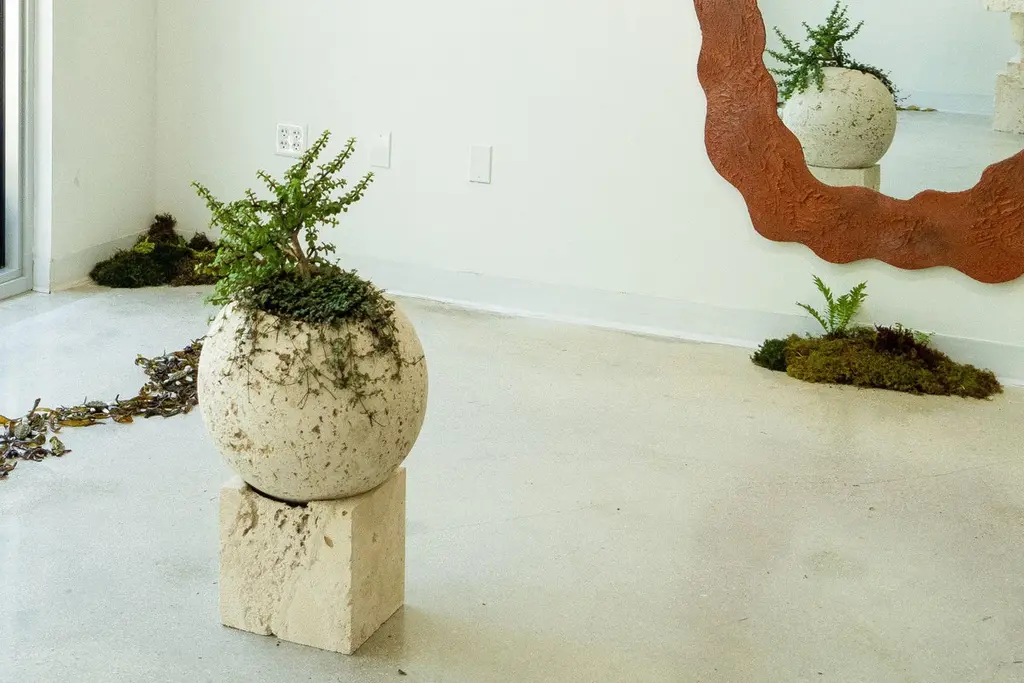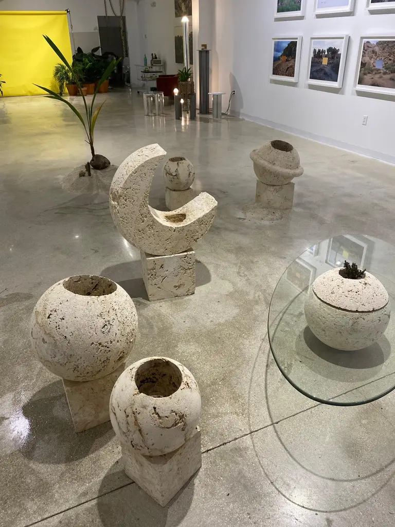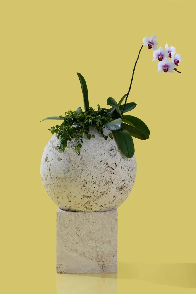 Made to order Florida keystone planter with base. 16” diameter 10x10” base.Inspired by Coral Castle, an oolite limestone structurecreated by the Latvian-American eccentric EdwardLeedskalnin in the 1920’s during a time where there wasno equipment to move or carve the large pieces. CoralCastle is noted for legends surrounding its creation thatclaim it was built single-handedly by Leedskalnin usingreverse magnetism or supernatural abilities to moveand carve numerous stones, each weighing many tons.Creating sculptural planters from this came to me as a3am thought. If Edward did it in the 1900s, how hardcan it be today? Apparently very challenging. I choseto go with Keystone, which is the bedrock found only inthe Florida Keys. You can no longer excavate keystoneunless a building is approved to break ground. Thesecond challenge was finding the fabricator who hasthe right CNC machine to cut spheres. Once again, theplants guided me. A nursery run would give me the leadwhere I could bring my vision to life. Tears included.