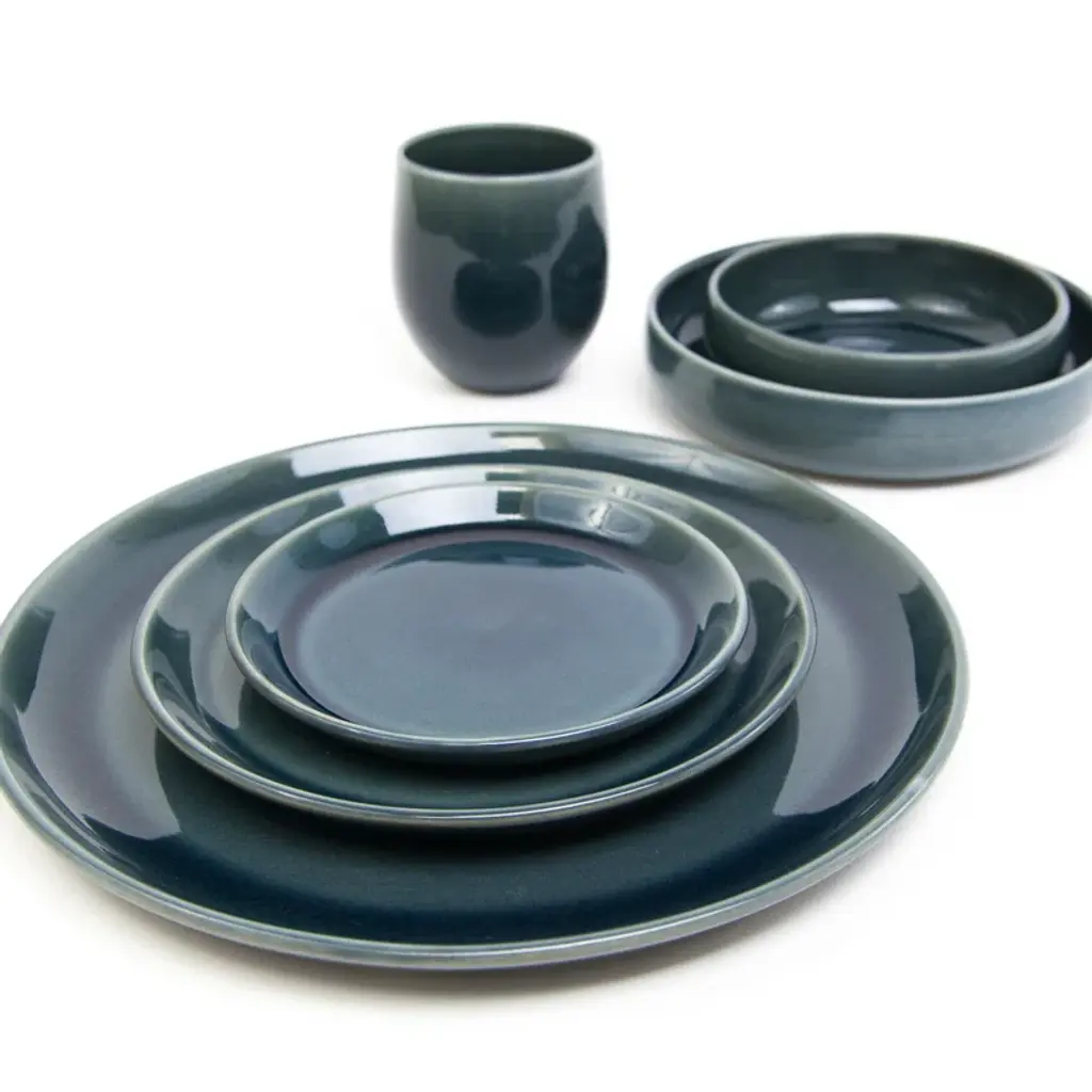 Statement-making dinnerware suits special occasions with its glossy cobalt blue finish. Accented with a reactive glaze around the rim, the set is marked by striking tonal variations and crackles in the glaze produced during firing. Set includes a dinner plate, salad plate, soup bowl and mug. CB2 exclusive.