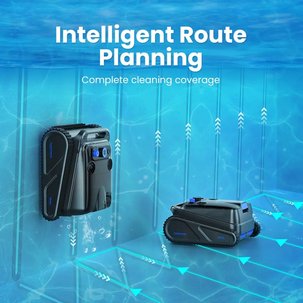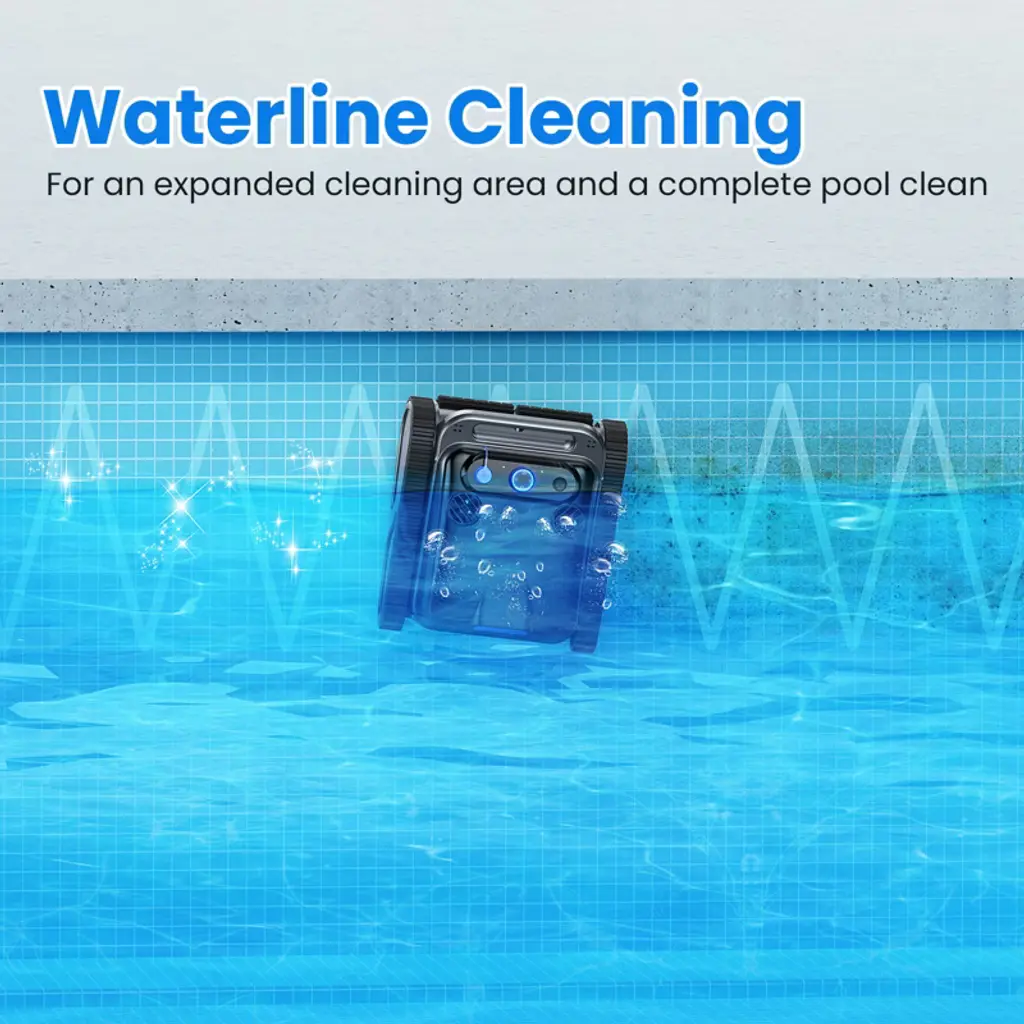 Powerful Suction: Equipped with upgraded motors for effective cleaning of pool floors, walls, and waterlines, capturing debris like small leaves and sand. Long Battery Life: Features a 10,500mAh rechargeable battery that charges in about 5 hours and provides up to 255 minutes of uninterrupted runtime. Cordless Convenience: The cordless design eliminates the hassle of tangled wires, making it easy to clean and store. Four Cleaning Modes: All-cover Mode: Cleans the entire pool including walls, waterline, and floor. Waterline Only: Targets just the waterline for focused cleaning. Floor Only: Perfect for cleaning the pool bottom. Wall Only: Efficiently cleans vertical surfaces. Intelligent Route Planning: Utilizes triple sensors (ultrasonic, water probe, and gyroscope) for systematic cleaning, ensuring no corners are missed and paths are not duplicated. User-Friendly Operation: Simply turn on the robot and submerge it in the pool to start the automatic cleaning process—no pumps needed. Self-Parking Function: The robot automatically parks alongside the edge of your inground pool when the battery is low or the cleaning task is complete.