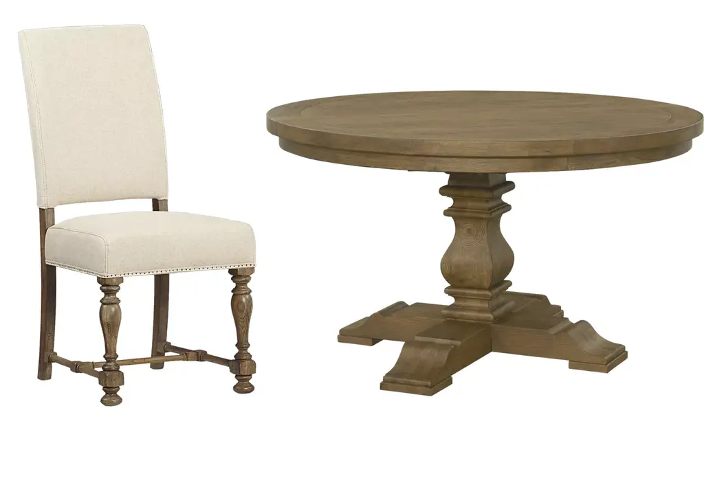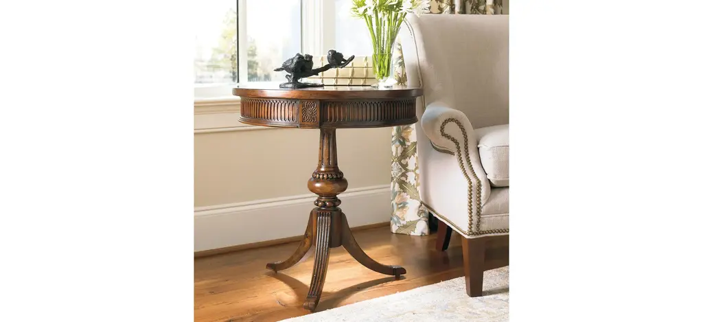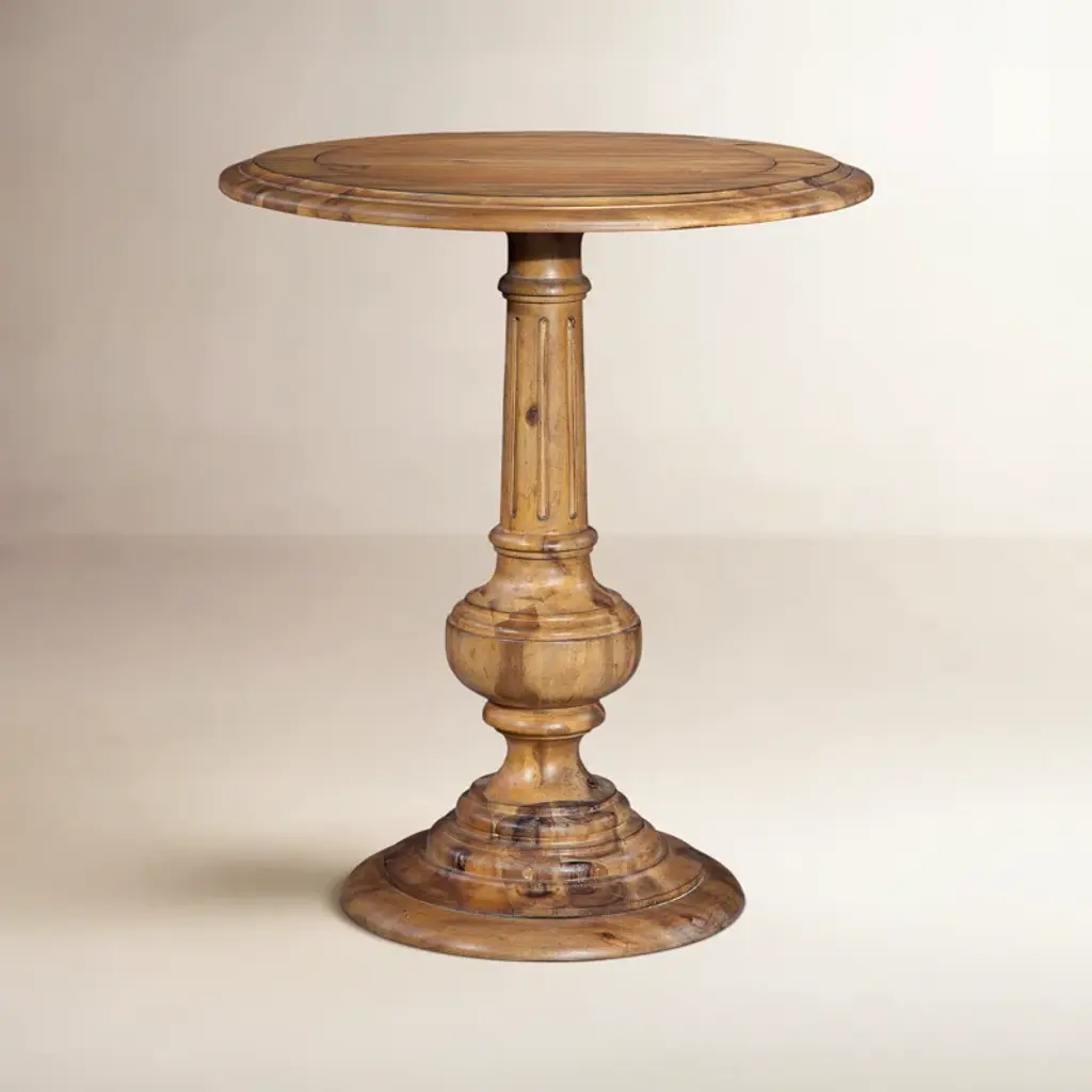 The Corey pedestal accent table is an enticing piece crafted from hardwood solids and walnut veneers.