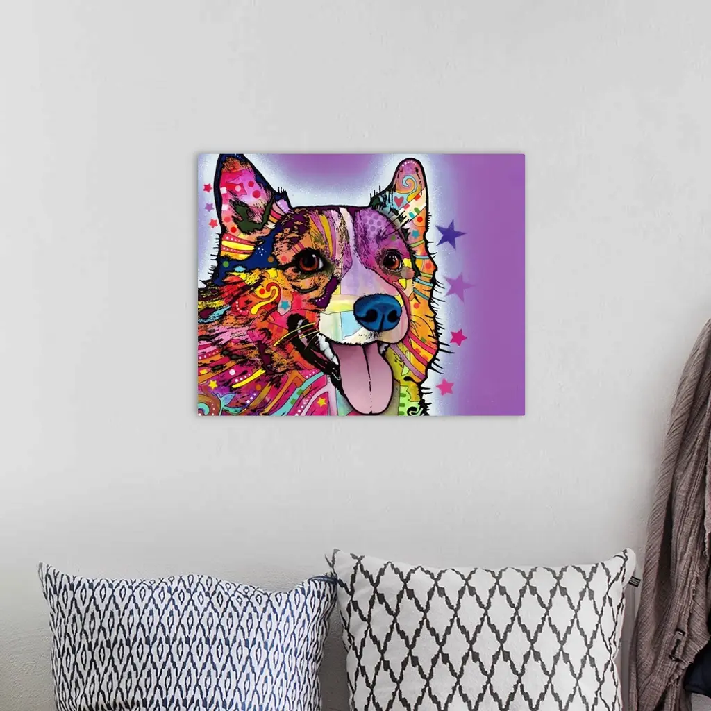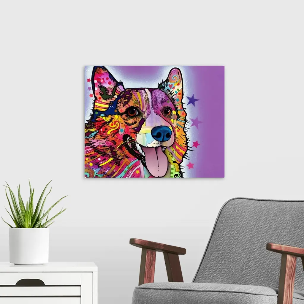 Large, horizontal canvas art of a corgi dog made up of colorful graffiti and various shapes on a bright background.