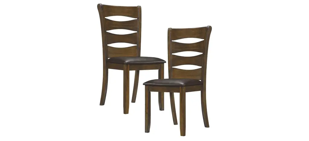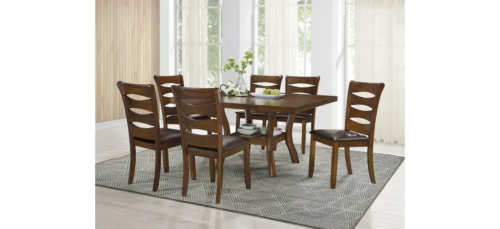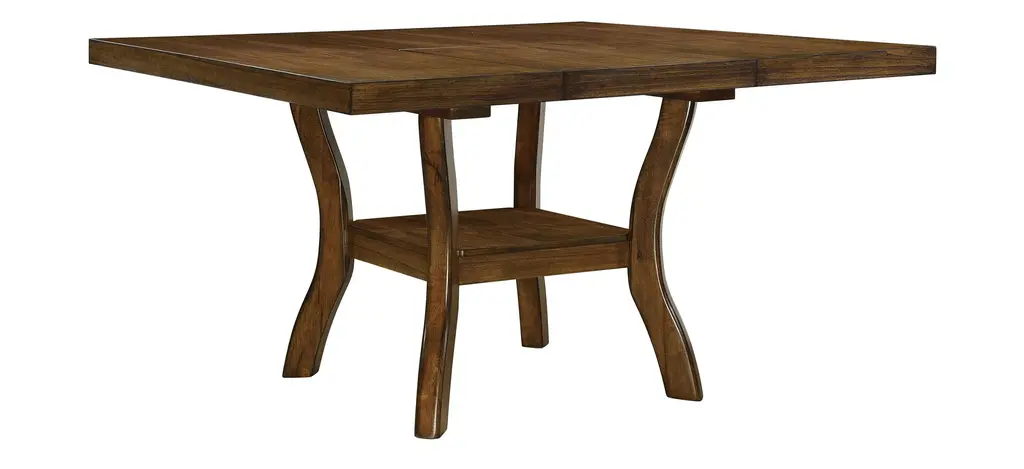 The transitional styling is paired with convenient function to create the Coring Dining set. Brown finish highlights the distinct grain of the mindy veneer of the table. The folding butterfly leaf allows for quick expansion of the table and convenient storage underneath the table's top while an under-table shelf allows for open display for tabletop accessories.