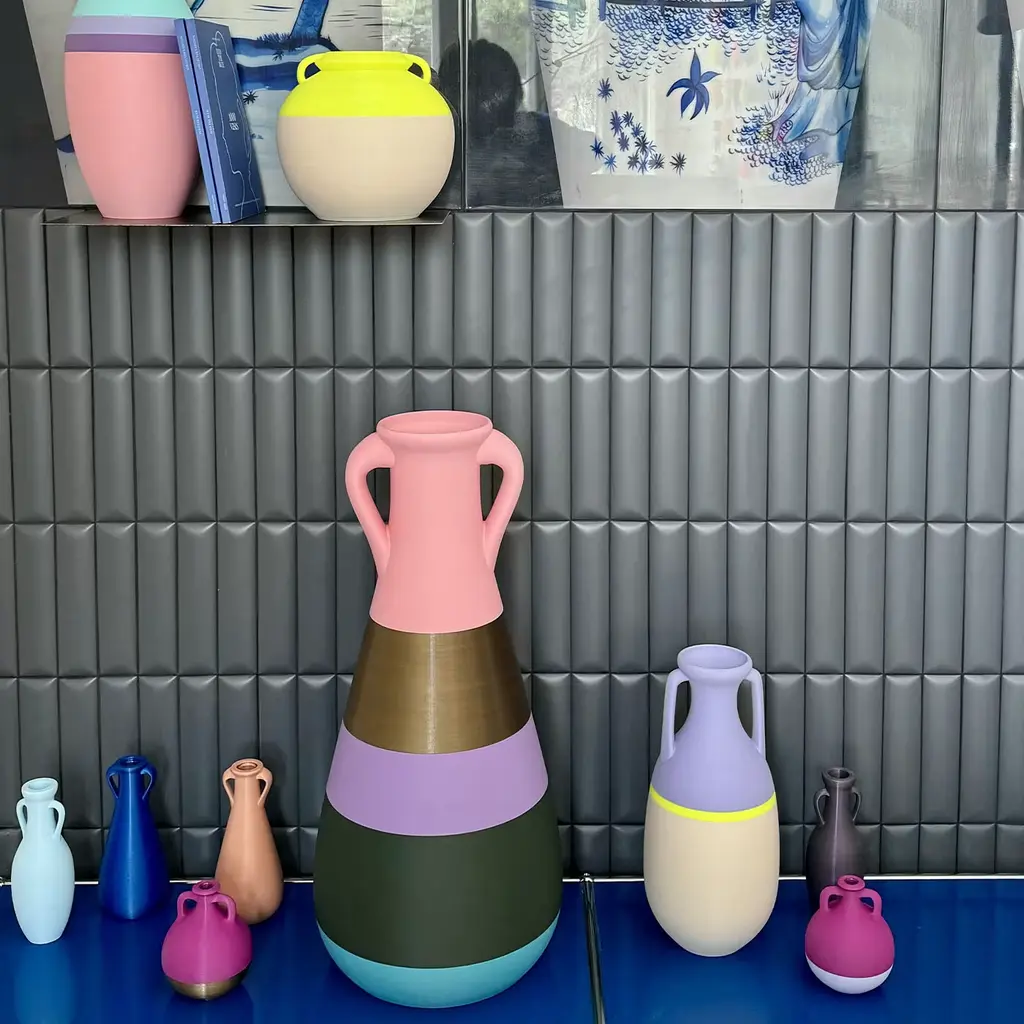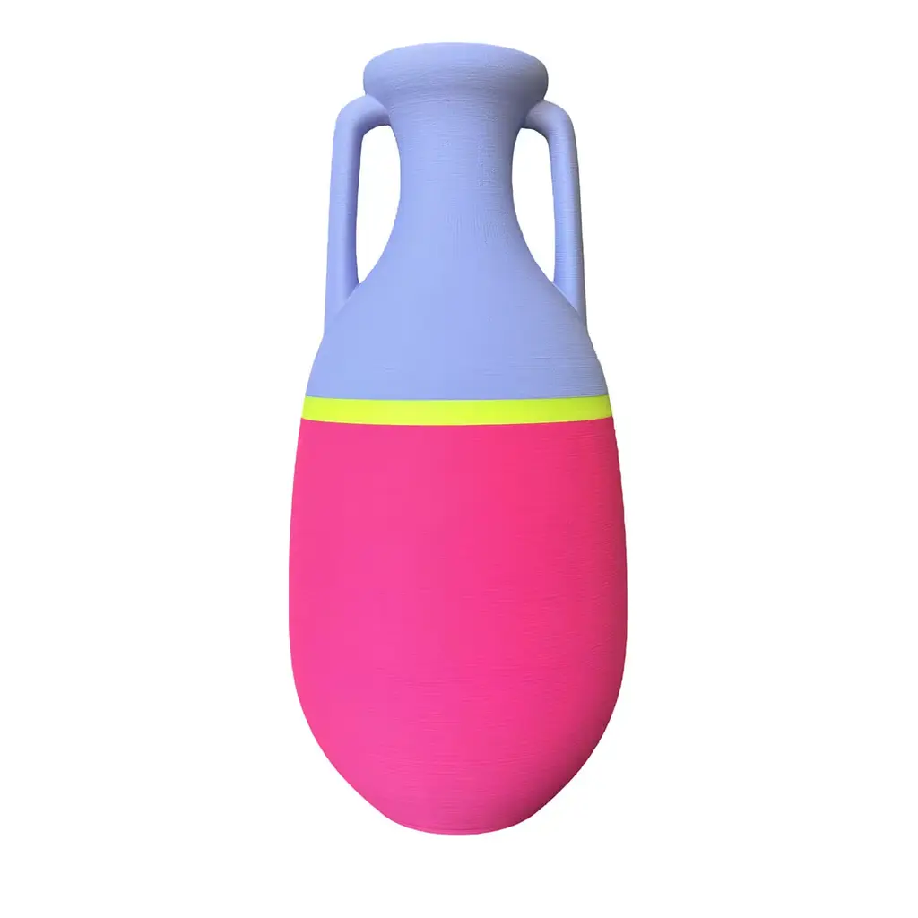 Pop reinterpretation of archetypal design. This vase is inspired by the Roman amphora typology by Heinrich Dressel, based on findings from the Monte Testaccio archaeological site in Rome. Made using 3D printing technology, it transforms PLA filaments into an iconic classical silhouette. Crafted exclusively with high-grade PLA, a thermoplastic derived from renewable resources and compostable in industrial facilities. The vase features an elegant combination of multicolor.