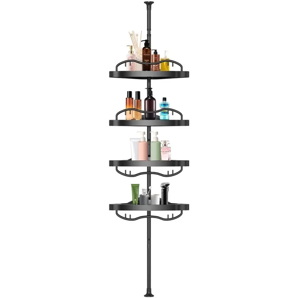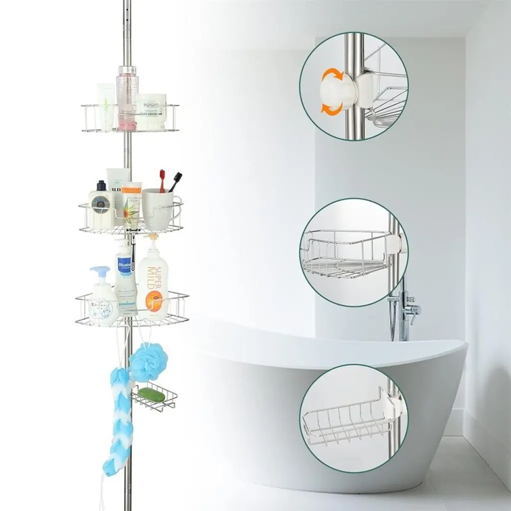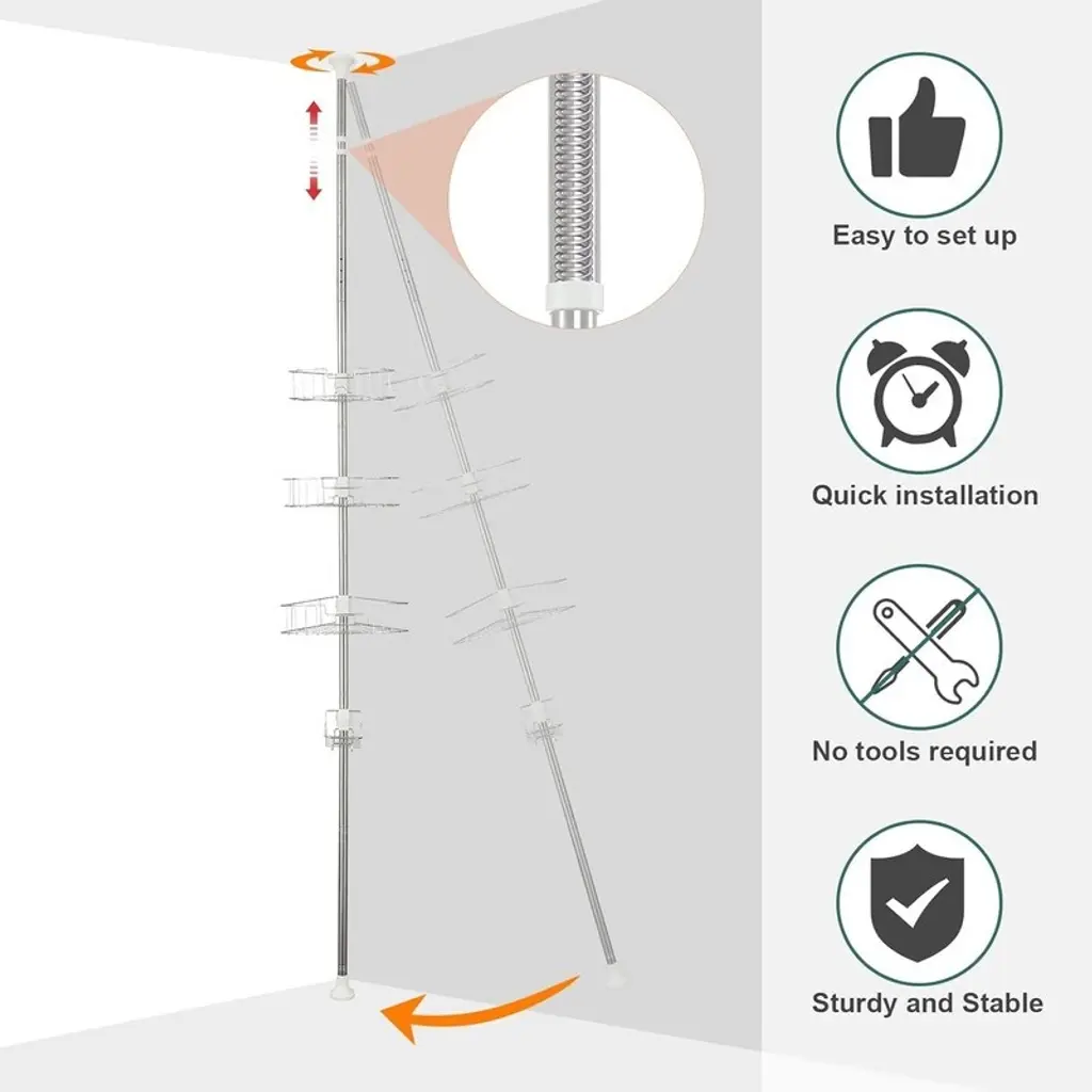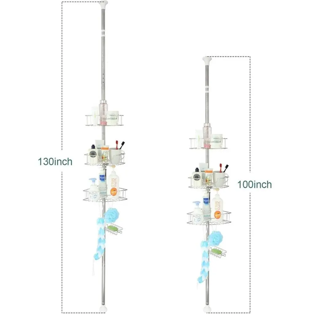 CORNER VERTICAL SHOWER CADDY: A shower caddy allows you to use the space in the corner of your bathroom to organize your toiletries. Avoid random piles. Keep your bathroom neat and organized. RUST-PROOF STAINLESS STEEL BAR: The shower caddy's pull bar and basket are made of 304 stainless steel, which can effectively prevent rust. Can be installed in bathroom, shower room, bathtub, toilet and kitchen. EXTRA LARGE STORAGE CAPACITY: The shower caddy has 4 large adjustable shelves, each shelf can store 4 large 64 oz pump bottles or 6 32 oz bottles. Perfect for holding shampoo, conditioner, soap, body wash, towel bars, razors, sponges, and other shower supplies. Tray is 3 inches deep so bath products won't fall out. SINKING DESIGN: The shelves have a self-draining system that won't pool water and will keep your bath products clean and tidy. Each shelf is secured by a rubber ring and is also easily adjustable. You can choose to install the safety webbing for more stability and firmness, not easy to shake. EASY INSTALLATION: 5 rods are included in the package, convenient for you to adjust the height, no need to cut the rods, won't damage the floor and ceiling. Strong extension spring is built-in to ensure the whole pole is firmly in place. This shower caddy can be adjusted to any height you need. The telescopic range of the tension rod is 40-120 inches.