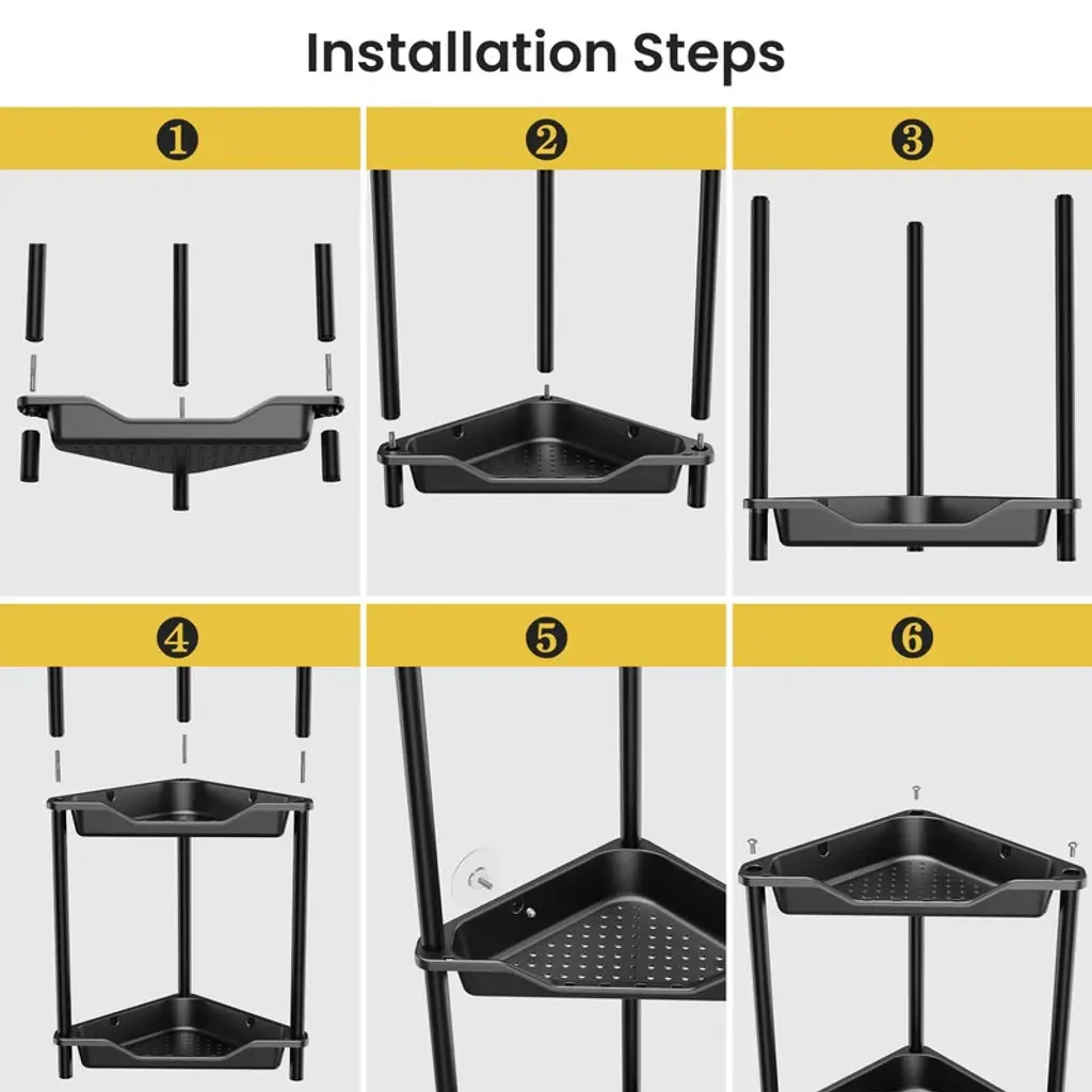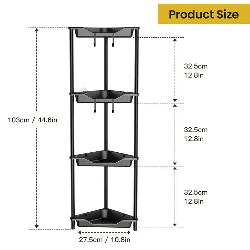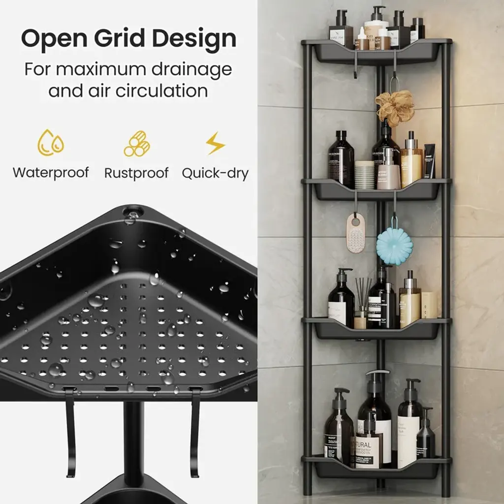 Rustproof, Waterproof,non Slip& No Drilling. 【LARGE LAYER SPACING】:Basket spacing per tier is 12.8in. 【DESIGN UPGRADED】:The perfect combination of high quality metal rod and plastic shelf. 【OPEN GRID DESIGN】:Drainage holes prevent water from pooling on the shelves. 【EASY TO ASSEMBLE】:Requires self-assembly, all required tools are included in the package. 【PACKAGE CONTAINS】:4 Tiers shelves, 2 reinforced transparent adhesive with screw and 4 stainless steel hooks.
