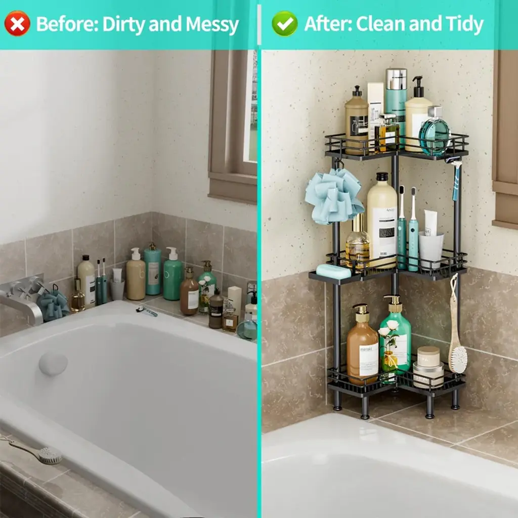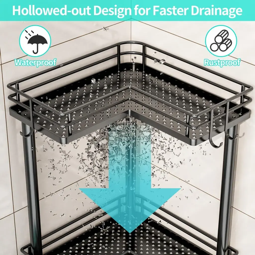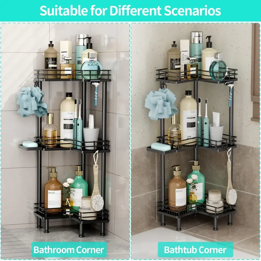 【Multi-functional Shower Organizer】 Are you still bothered by your bathroom clutter? The shower shelf for inside shower offers different tiers for you to choose from , and it comes with 4 hooks and a soap holder to keep your bathroom items organized. The large tier pitch of the bathroom organizer provides you with a larger capacity. 【Adjustable Feet】Our corner shower caddy has four adjustable feet to give you a more stable and comfortable using experience. With good load-bearing capacity, the shower shelves allows you to store your items without worrying about tilting and collapsing as you fill it up. 【Waterproof & Rustproof Shower Tower】Made of high quality stainless steel, the shower caddy corner is sturdy, durable as well as waterproof and rustproof. The drainage holes of the shower shelf are designed to drain quickly to keep it dry. 【Space-saving Shower Storage】Our shower organizer corner size is 9.45*1.97*4.72in, overall length is 30.94 in, won't take up too much space. It helps you organize space in your bathroom and have a more comfortable bathing experience. Warm Tips:If you need to use the corner shower shelves on the corner of the bathtub, please measure the size of the corner of your bathtub before purchasing.