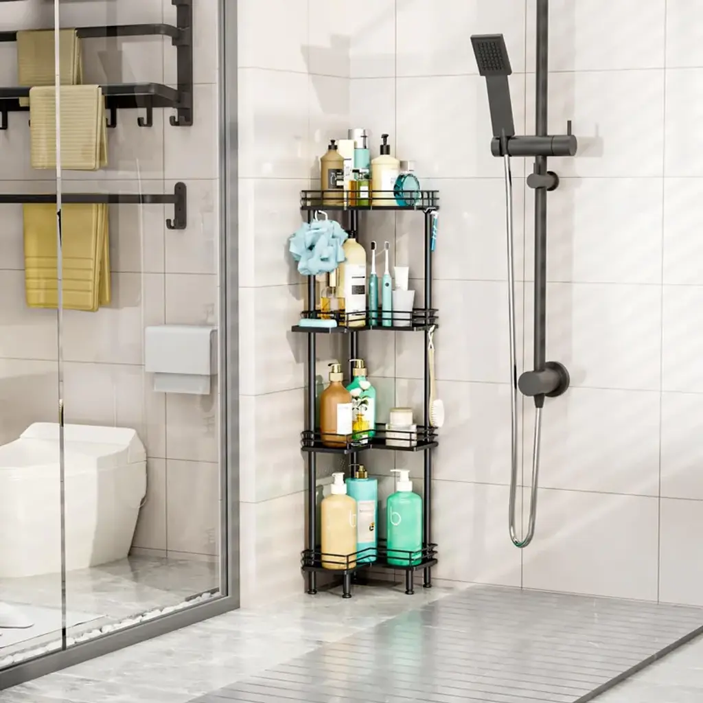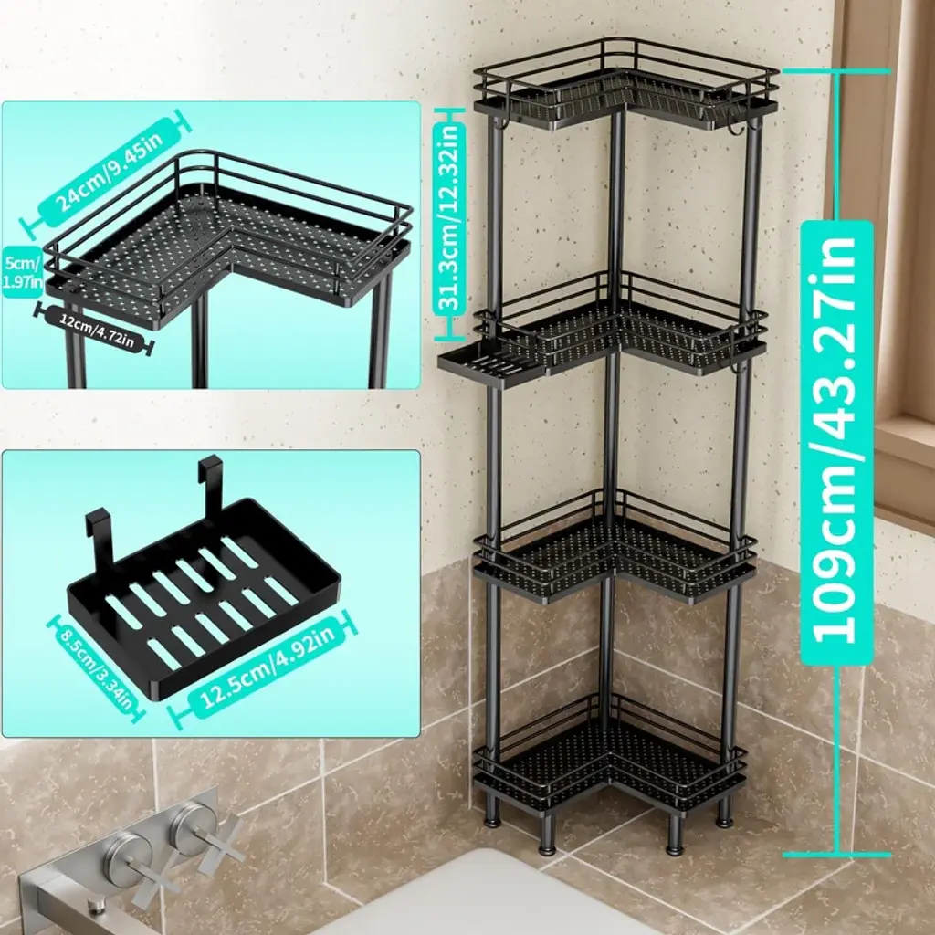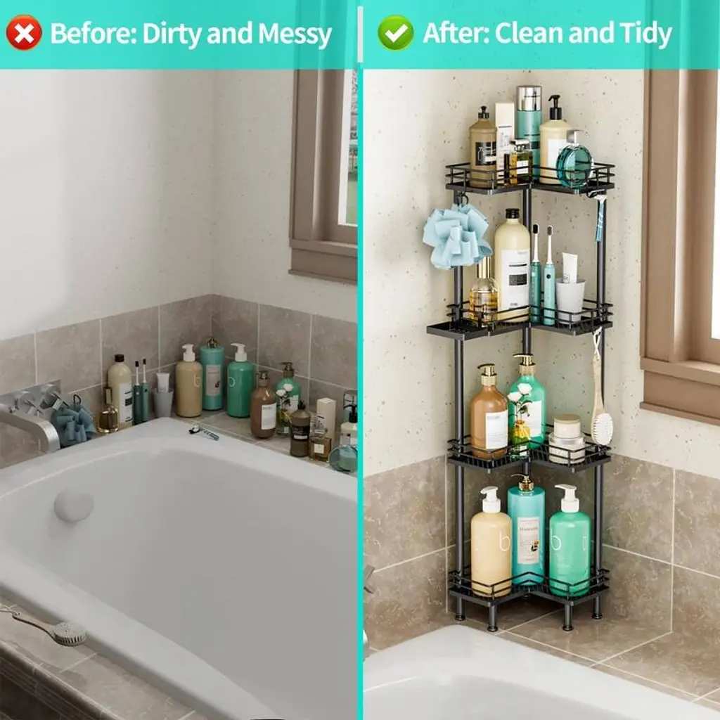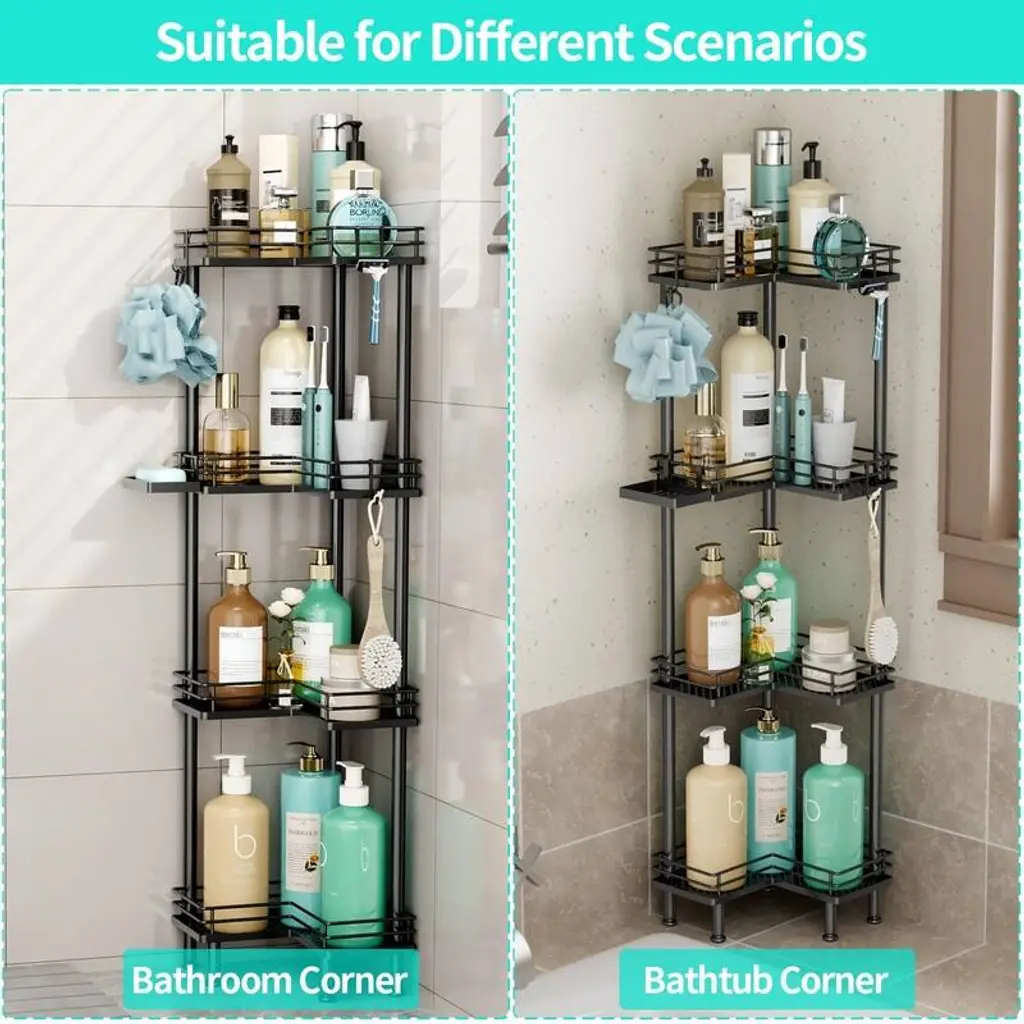 【Multi-functional Shower Organizer】 Are you still bothered by your bathroom clutter? The shower shelf for inside shower offers different tiers for you to choose from , and it comes with 4 hooks and a soap holder to keep your bathroom items organized. The large tier pitch of the bathroom organizer provides you with a larger capacity. 【Adjustable Feet】Our corner shower caddy has four adjustable feet to give you a more stable and comfortable using experience. With good load-bearing capacity, the shower shelves allows you to store your items without worrying about tilting and collapsing as you fill it up. 【Waterproof & Rustproof Shower Tower】Made of high quality stainless steel, the shower caddy corner is sturdy, durable as well as waterproof and rustproof. The drainage holes of the shower shelf are designed to drain quickly to keep it dry. 【Space-saving Shower Storage】Our shower organizer corner size is 9.45*1.97*4.72in, overall length is 30.94 in, won't take up too much space. It helps you organize space in your bathroom and have a more comfortable bathing experience. Warm Tips:If you need to use the corner shower shelves on the corner of the bathtub, please measure the size of the corner of your bathtub before purchasing.