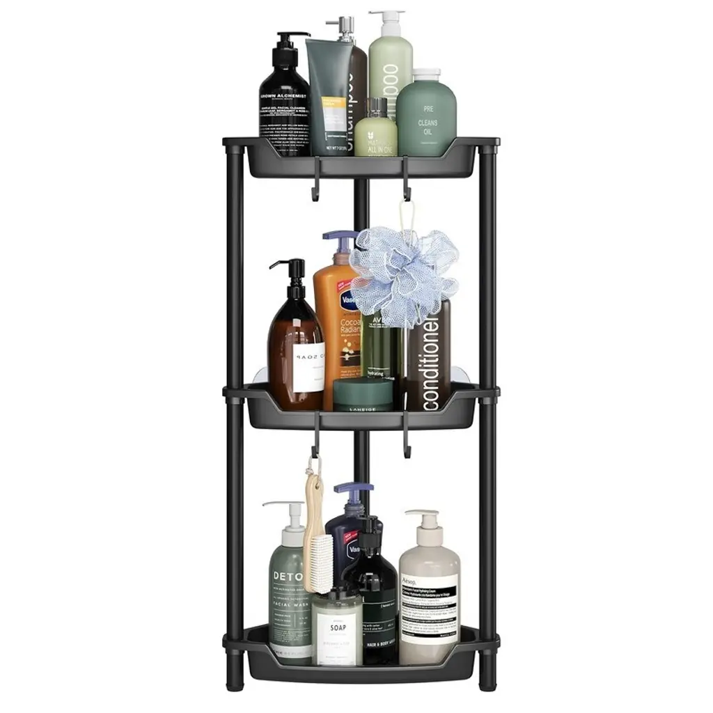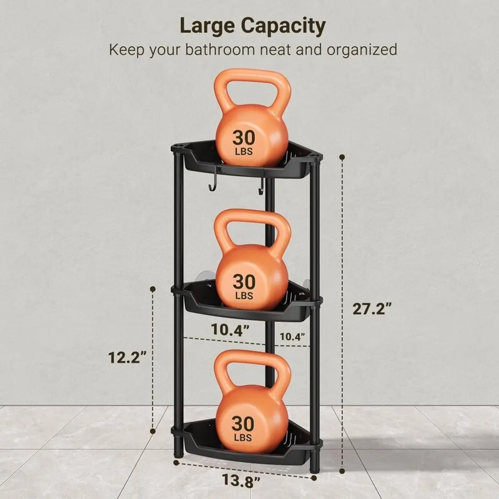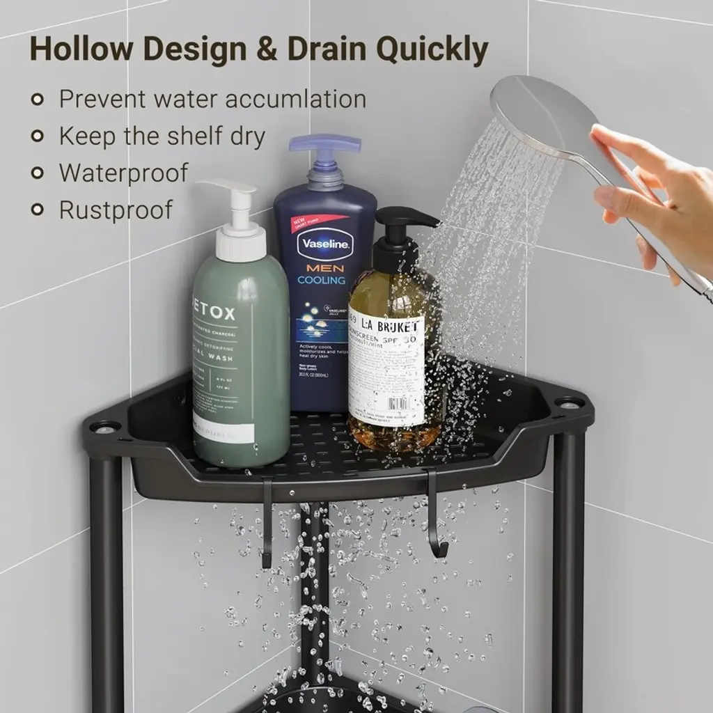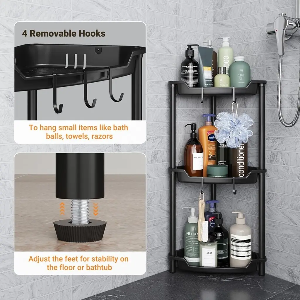 Durable and Rustproof Design: Built with sturdy metal support poles and high-quality plastic baskets, our corner shower shelves are engineered to withstand the humid bathroom atmosphere, ensuring long-lasting performance. Features 4 removable hooks for convenient hanging of razors, sponges, brushes, towels, and moreStability Without Drilling: Say goodbye to wobbling! Our shower racks come with 2 reinforced transparent adhesives for unshakeable stability, eliminating any risk of toppling. 3 adjustable rubber feet provide additional support on uneven surfaces, giving you peace of mind during your daily routine. Perfect for your bathroom storage needsEfficient Water Drainage: Equipped with strategically placed drainage holes, our shower shelf prevents water buildup and facilitates quick drainage. This innovative hollow design not only keeps the shelf dry but also maintains a tidy and organized storage areaSpace-Saving & Generous Layer Spacing: Featuring a unique scalloped design, our floor standing shower caddy maximizes corner space and creates a more open feel in your bathroom. With ample 12.2 inches between shelves, it easily accommodates large bottles of shampoo, body wash, and other toiletries—perfect for various corners including shower, bathtub, kitchen, vanity, and RV spacesQuick and Easy Assembly: Forget the hassle of traditional mounted adhesive shower shelves! Our shower storage is designed for quick and easy setup with no drilling needed. Assemble in just minutes without damaging your walls or ceilings, making it an ideal choice for your bathroom