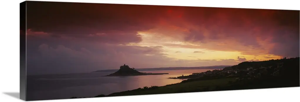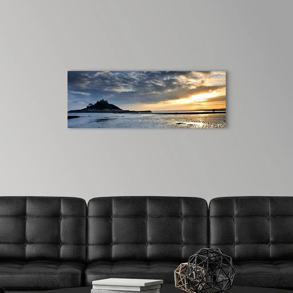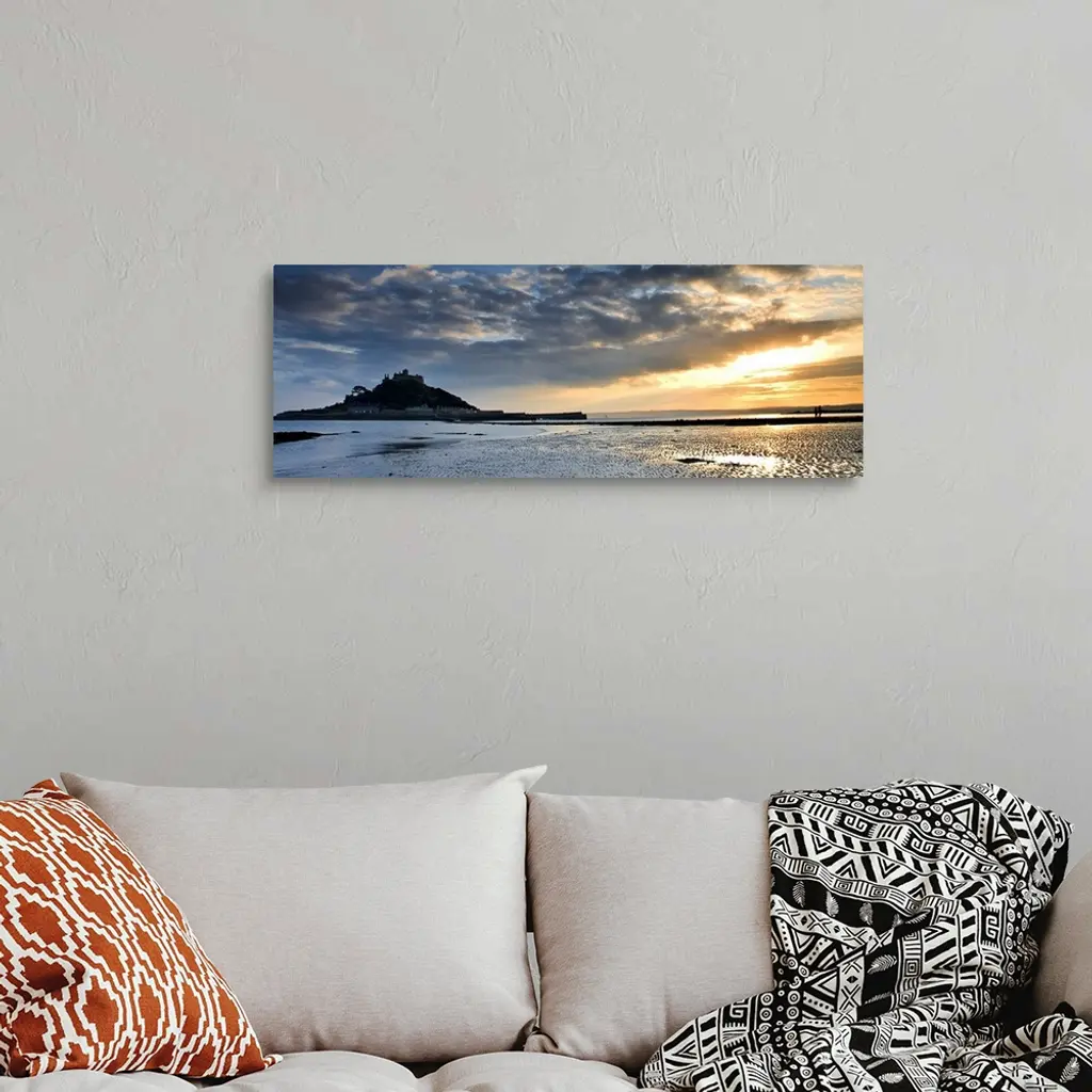 St. Michaels Mount, Cornwall, England, UK, at sunset with a dramatic sky and golden light reflected in wet rippled sand.