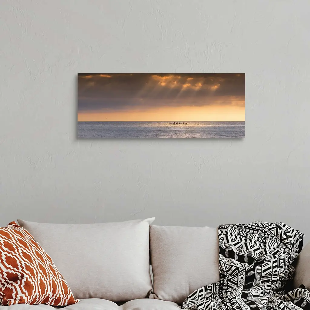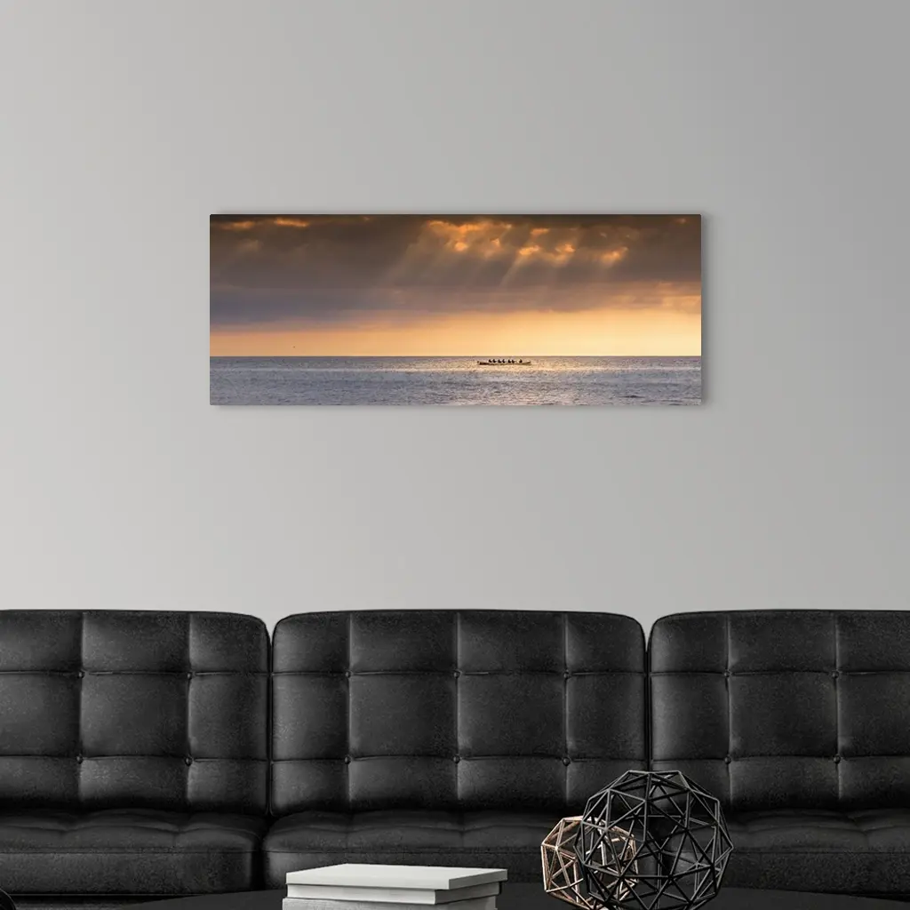 A panoramic image of the 200 year old Cornish Pilot Gig Dove being rowed as the sun sets over Fistral bay in Newquay in Cornwall.
