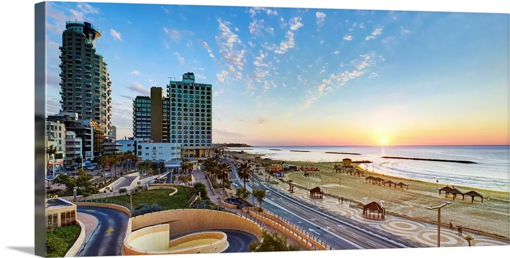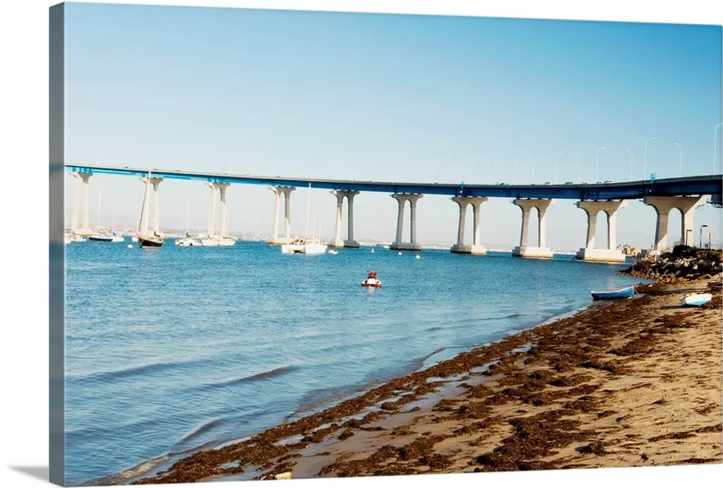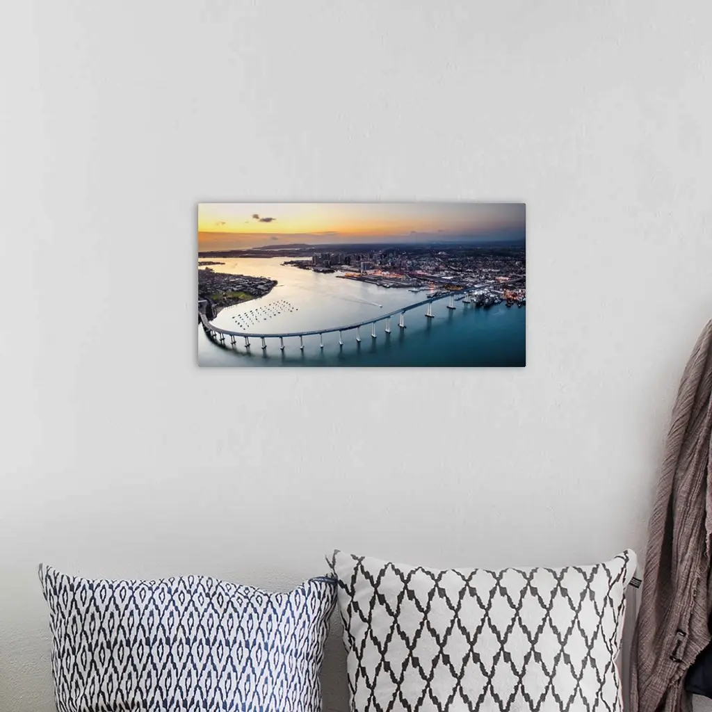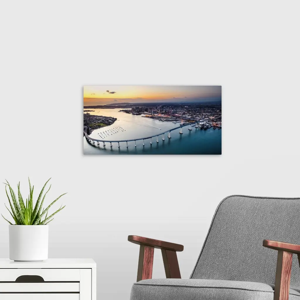 Aerial view of the Coronado Bridge in San Diego, California, at sunset.