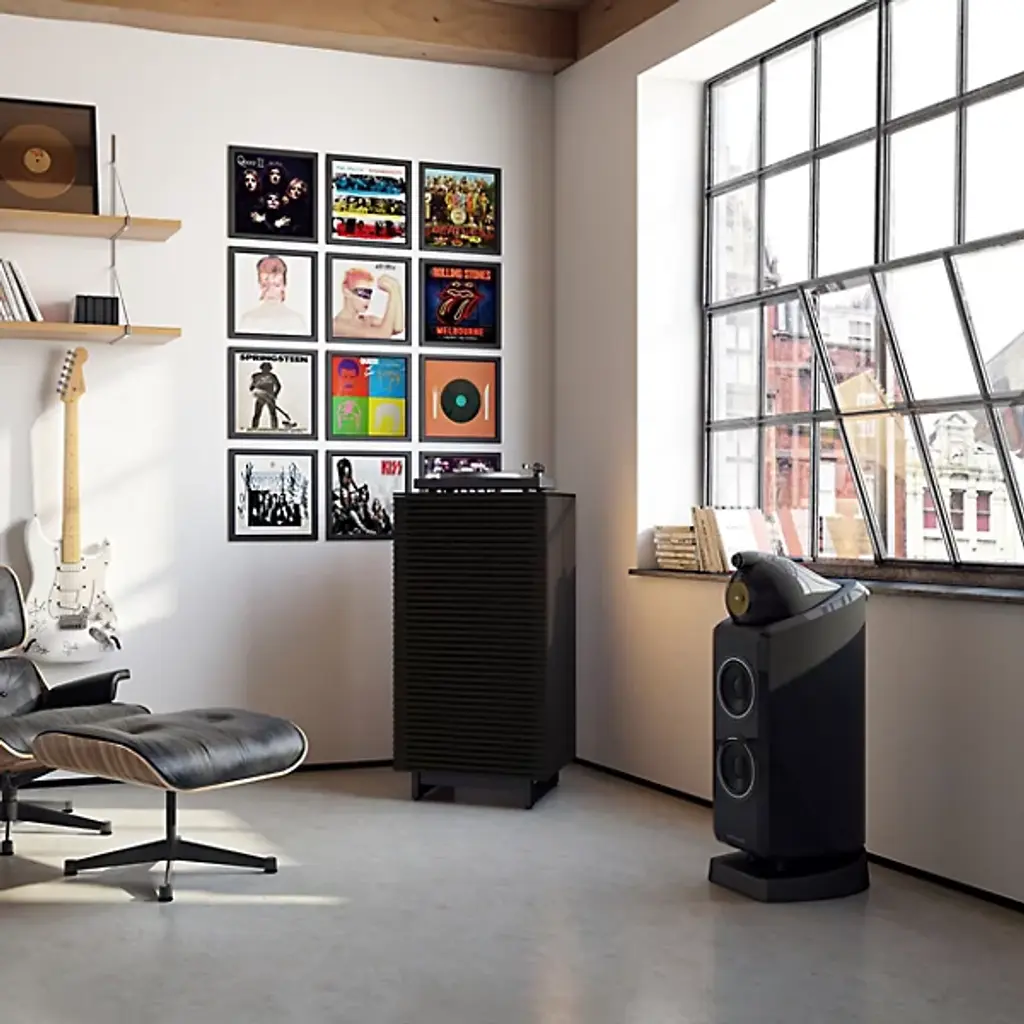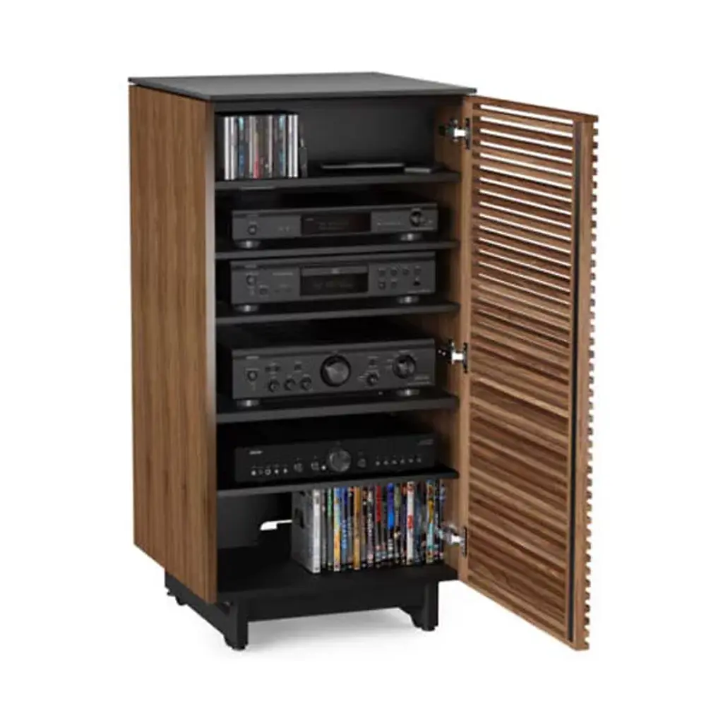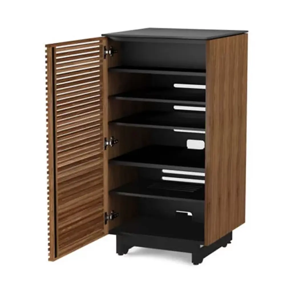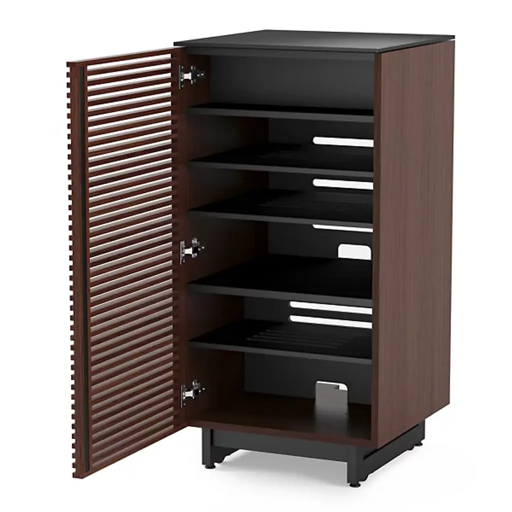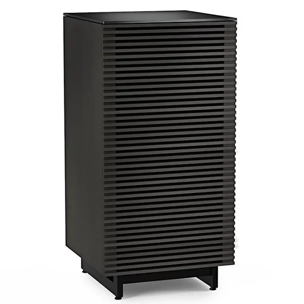 The BDI Corridor A/V Tower will keep all your A/V equipment and media looking neat, organized and beautifully modern. With black micro-etched tempered glass on top and a black steel base, this vertical tower features the distinctive Corridor louvered hardwood door (which can be mounted on either side as needed. Within the tower, a number of adjustable shelves and cable management holes make it easy to customize.