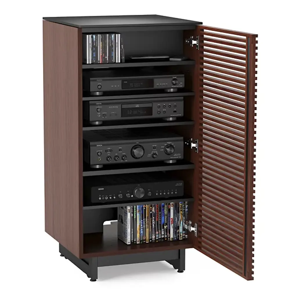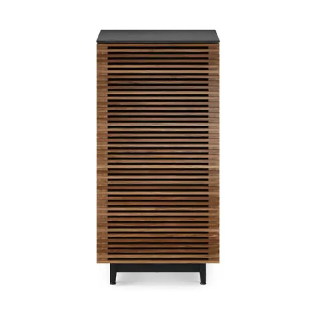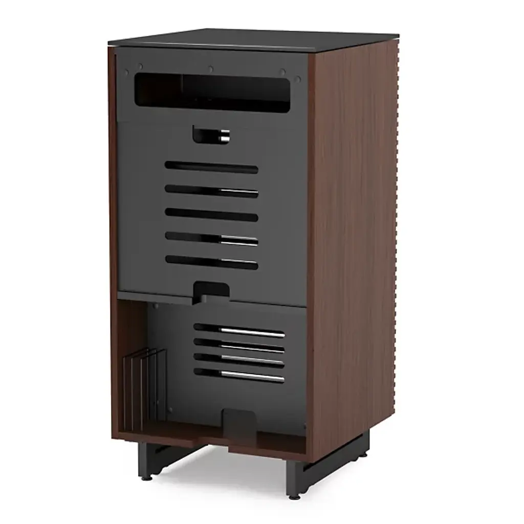The BDI Corridor A/V Tower will keep all your A/V equipment and media looking neat, organized and beautifully modern. With black micro-etched tempered glass on top and a black steel base, this vertical tower features the distinctive Corridor louvered hardwood door (which can be mounted on either side as needed. Within the tower, a number of adjustable shelves and cable management holes make it easy to customize.