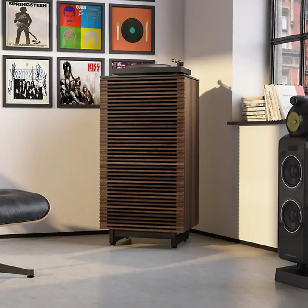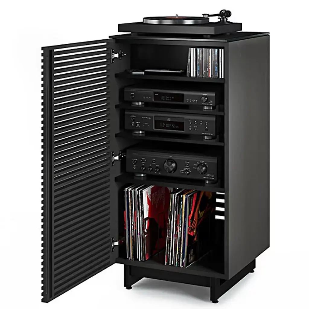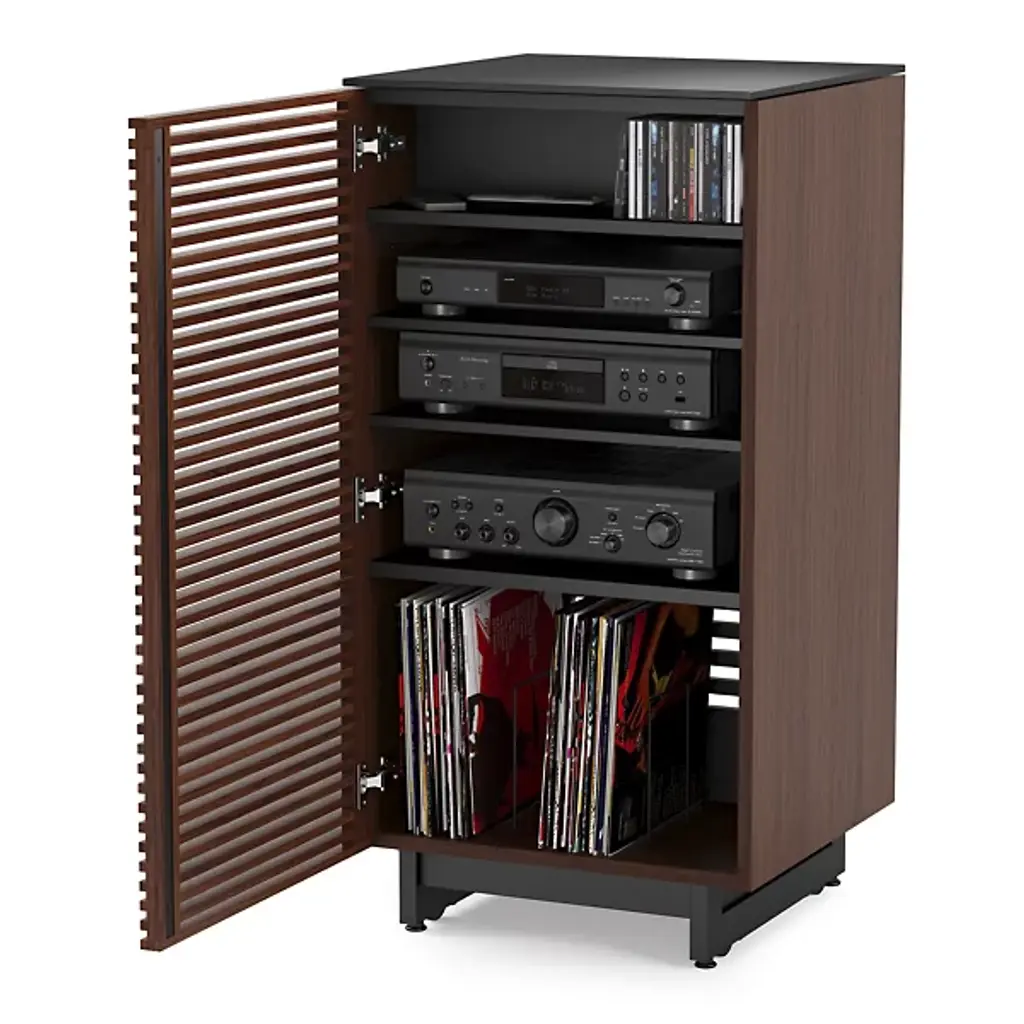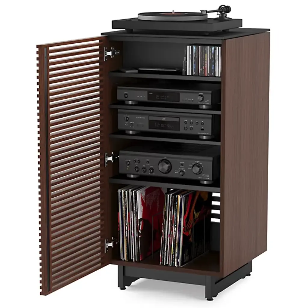 The BDI Corridor A/V Tower will keep all your A/V equipment and media looking neat, organized and beautifully modern. With black micro-etched tempered glass on top and a black steel base, this vertical tower features the distinctive Corridor louvered hardwood door (which can be mounted on either side as needed. Within the tower, a number of adjustable shelves and cable management holes make it easy to customize.