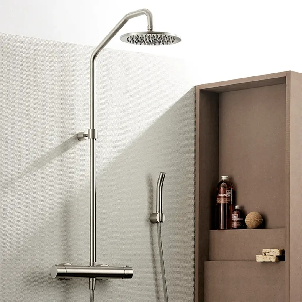 CORSIVO | Thermostatic column external shower, shower head, support and hand shower - stainless steel AISI 316 LCORSIVO is a wall-mounted built-in set, mixer plus spout Ø21 L.190 H 180 – AISI 316 L stainless steel.FEATURES – BASIN TAPS: 2-hole, wall-mounted, basin mixer, with aerator. Available finishes: brushed stainless steel, polished stainless steel, deep grey PVD, gold PVD, ceraMINA colors.The slim spout, the straight aerator, the consistent inclination of the lines. Almost as if the tap leans towards the user to make its use more comfortable, especially in the built-in solutions. This is how Corsivo guides water toward the hands, in a complete collection where the fine detailing on the stainless steel underlines the product’s artisanal nature and enhances its surfaces. The collection is also available in the ceraMINA version: a palette of ceramic colors with pearly shades designed to match the perfect hue for every project. From pearl black to calm green, passing through sweet blue, light rose, rich brown, vivid orange, and golden yellow.