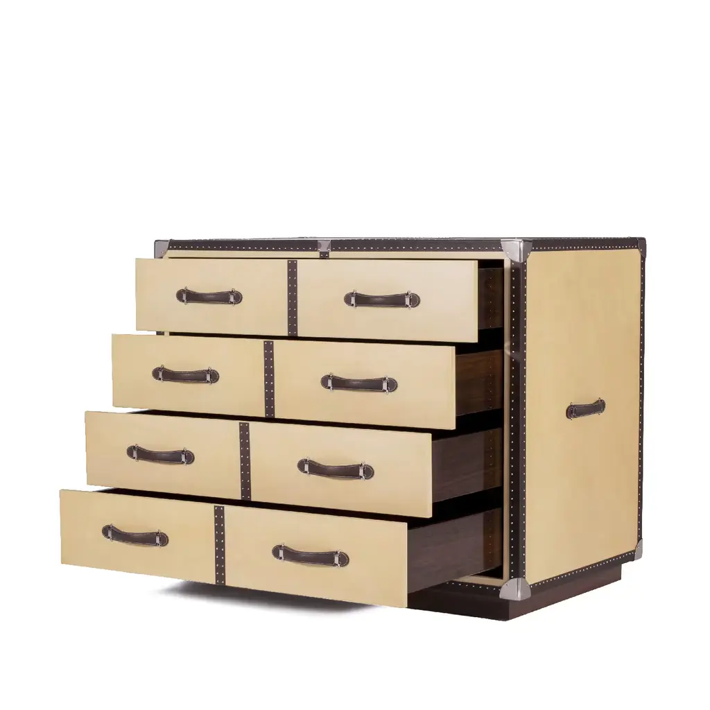 This exquisite trunk evokes the design of the roaring twenties and can be displayed at the center of a room. The structure is in poplar wood with wheels at the base for easy mobility and the exterior is covered in leather. The interior contains four drawers featuring "blumotion" shock absorption system, in Italian walnut wood with a polished finish (a microfiber lining can be added). All the handles are in full brass with gold and nichel finish.