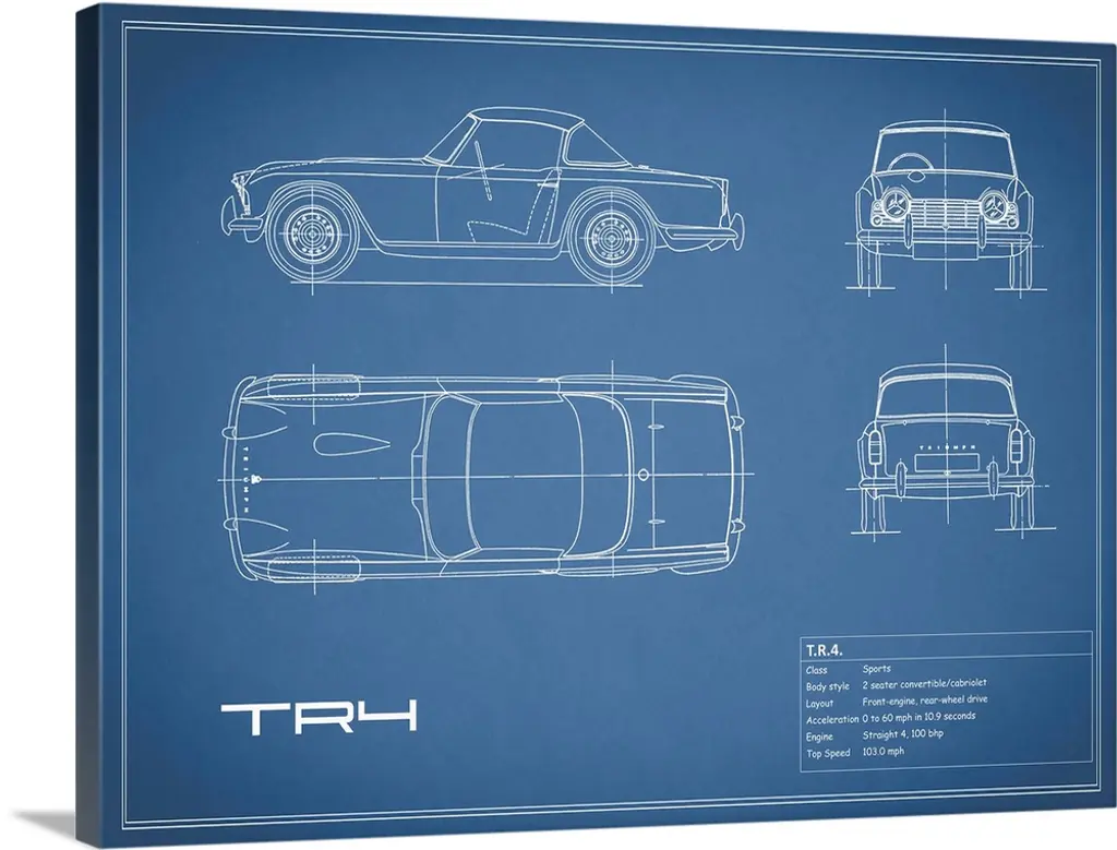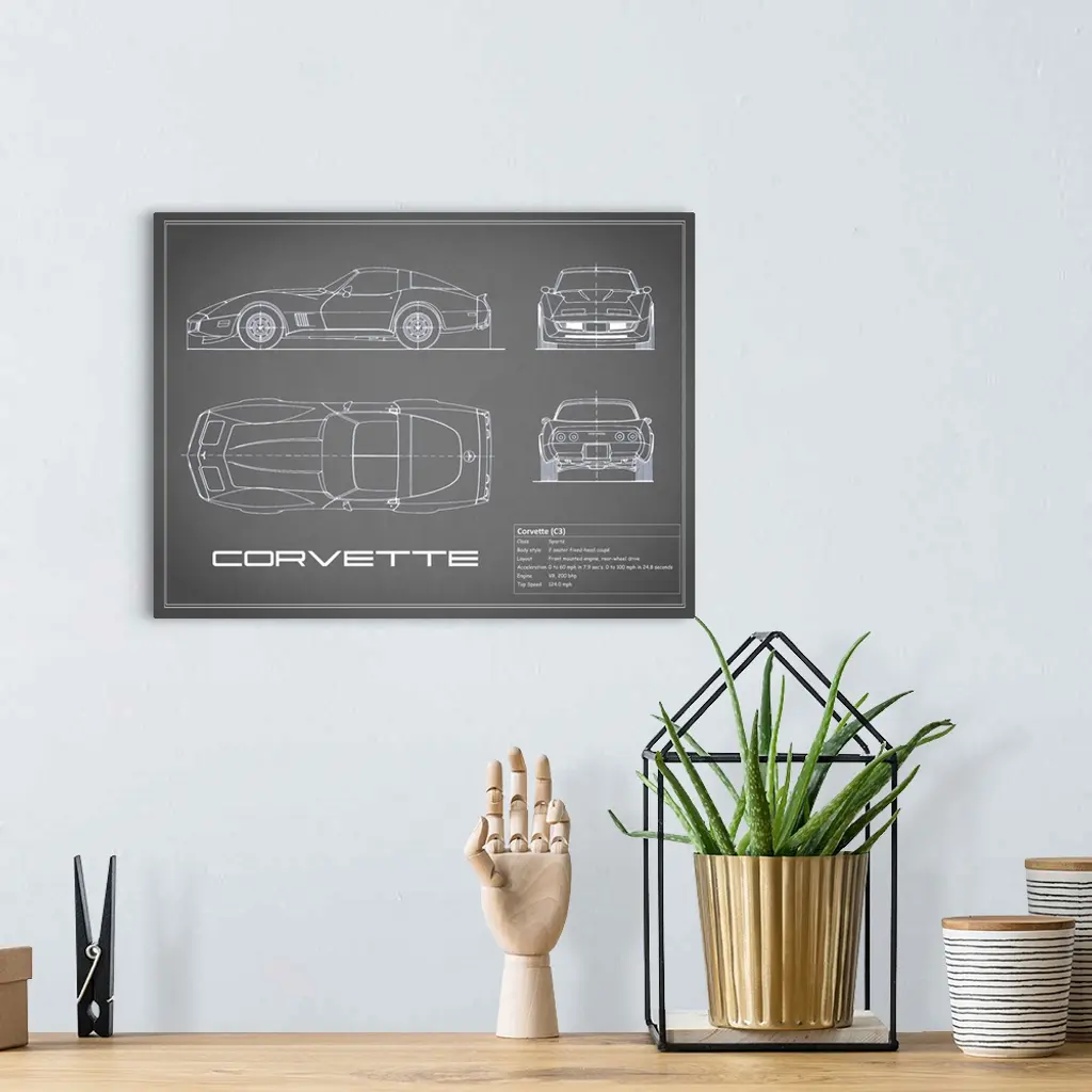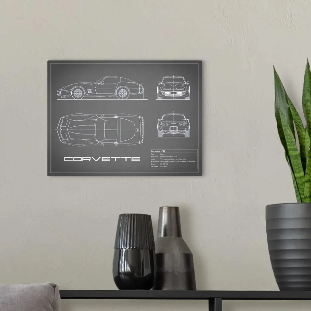 Antique style blueprint diagram of a Corvette C3 printed on a Grey background.