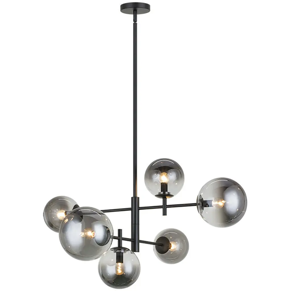 Cosmo is a suspension lamp with 8 lights in transparent borosilicate glass on the outside and satin finish on the inside with black painted metal. The lamp is equipped with two tubes that can be used to raise and lower the lamp itself.Technical information:- Light source: G9- Power8 x max 40w