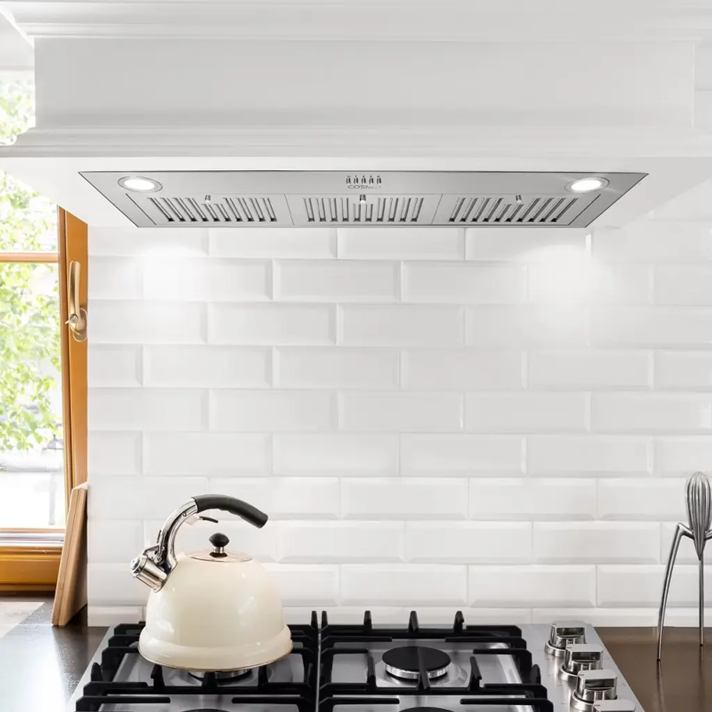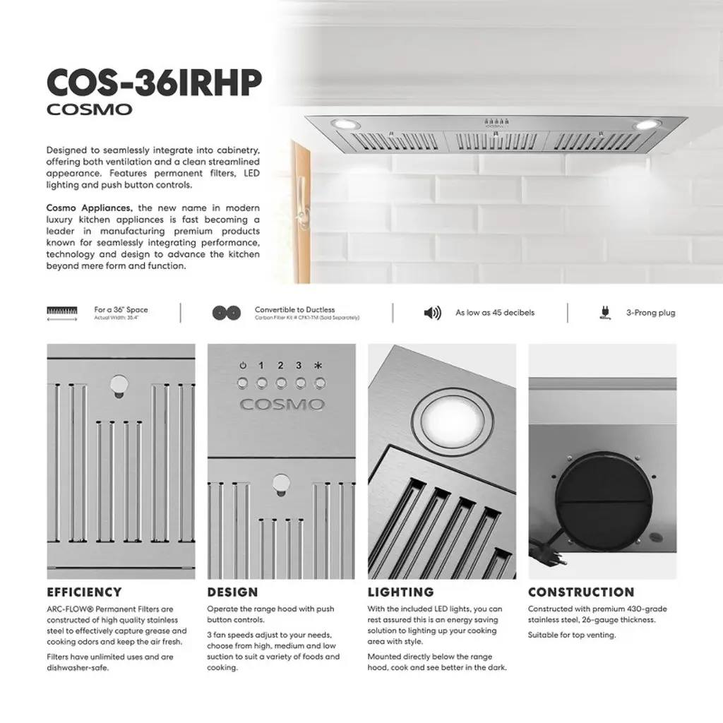 Upgrade your kitchen with Cosmo’s COS-36IRHP insert range hood for a modern and seamless design. Fits easily into a custom cabinet enclosure with premium brushed stainless steel built to withstand high heat, grease, oil and steam. Trap grease and cooking odors with 3 fan speeds and illuminate your kitchen with the built-in energy efficient LED lights for easier visibility. Clean-up is a breeze with easily removable, permanent, dishwasher-safe stainless steel filters. Save money year-round with unlimited uses on these filters. A 3-prong power cord is included for easy installation. A better home starts with Cosmo. Part of the Lumin Collection bringing enhanced functionality and design, offering a well-rounded option for those looking for more convenience and style in an appliance. • The Lumin Collection brings enhanced functionality and design, offering a well-rounded option for those looking for more convenience and style in an appliance • Ultra-quiet design with insert range hood mounting Easy-to-use push button controls • 3 fan speeds adjust to your needs, choose from high, medium, and low suction to suit a variety of foods and cooking • 380 CFM airflow capacity provides efficient performance • Noise level as low as 45 dB on lowest fan speed with rigid ducting (sold separately) under optimal conditions • Two 1.5-Watt energy efficient LED lights help illuminate the cooktop surface for added visibility, mounted directly below the range hood • Cosmo ARC-FLOW permanent filters are constructed of high-quality stainless steel to effectively capture grease and cooking odors; our ARC-FLOW permanent filters are dishwasher-safe and extremely durable; no need to replace these filters, simply drop them in the dishwasher for easy maintenance • 5.9 in. round duct exhaust opening, a backdraft damper is included to prevent air from coming back inside • Convertible to ductless operation with Carbon Filter Kit Part CFK1-TM (sold separately) • 3-prong power cord included for easy installation • Made of premium 430-grade stainless steel, 26-Gauge thickness • 2-year limited warranty, trust our insert range hood will provide years of trouble-free use • ETL Listed: ETL Listed products demonstrate compliance to North American safety standards published by relevant NRTLs (Nationally Recognized Testing Laboratories)
