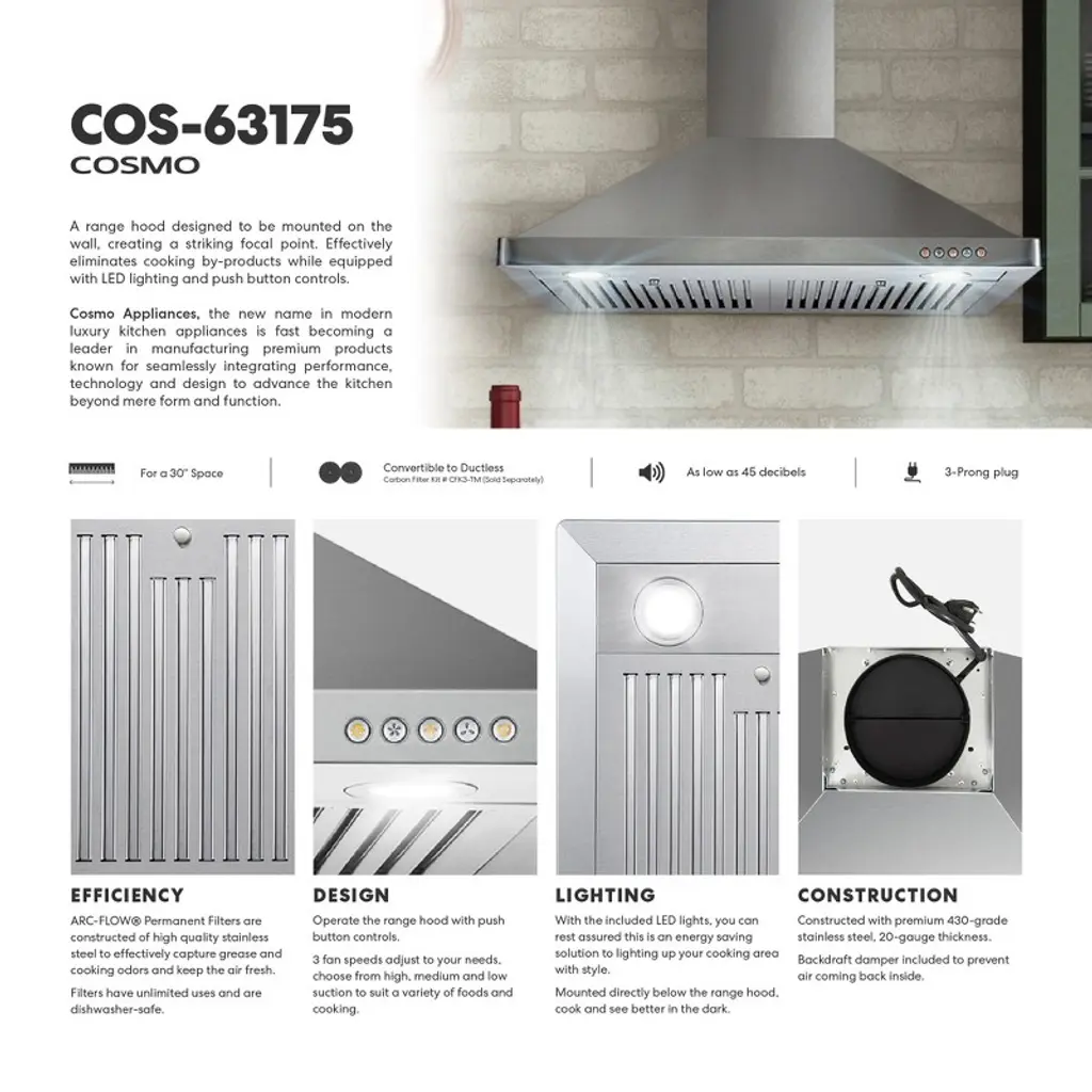 Cosmo Cos-63175 30 In. Vista Collection 380 Cfm Ducted Wall Mount Range Hood, Button Controls, Led Lights, Stainless Steel