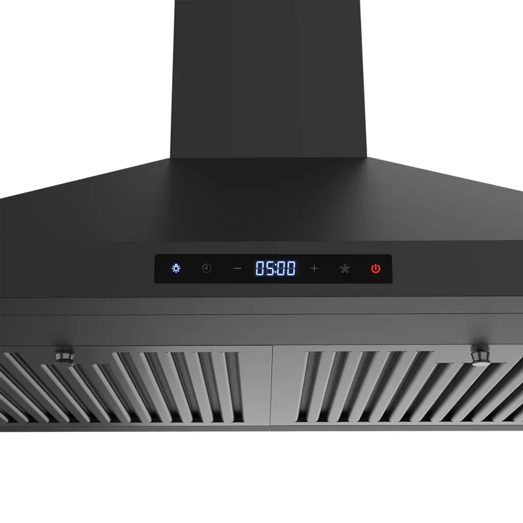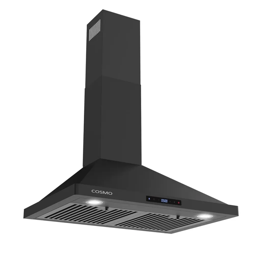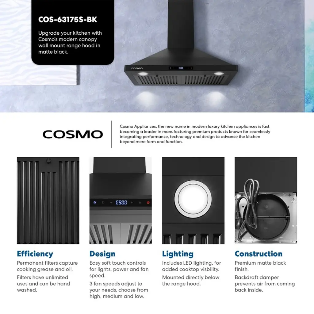 Upgrade your kitchen with Cosmo’s COS-63175S-BK modern canopy wall mount range hood. Our contemporary styling will feel right at home with modern kitchen decor. Experience the quality of matte black construction, built to withstand high heat, grease, oil and steam. Our range hood includes a seamless three sided chimney for clean, elegant lines. The motor provides 380 CFM of air flow, and our Cosmo ARC-FLOW permanent filters are easy to clean. This range hood is quiet and energy efficient, utilizing high lumen LED lighting for cost savings. The 3 prong, 120V power cord is included for easy use. Trust Cosmo for your next appliance for premium quality at factory direct prices. Part of the Vista Collection, bringing enhanced functionality and design, offering a well-rounded option for those looking for more convenience and style in an appliance. • The Vista Collection brings enhanced functionality and design, offering a well-rounded option for those looking for more convenience and style in an appliance • Range hood features ultra-quiet design to effectively remove smells and odors when cooking • Easy-to-use touch controls with integrated back lit digital display; just a tap of a finger controls the fans and lights • 3 fan speeds to adjust to your needs; choose from high, medium and low suction to suit a variety of foods and cooking • Noise level as low as 45 dB on lowest fan speed with rigid ducting (sold separately) under optimal conditions; range hood comes with flexible ducting for convenient installation • Handle multiple pots, pans and burners with ease with 380CFM of suction- enough to take care of steam, grease and smoke from even the largest meals • Energy efficient LED lights under the hood provide bright white light to brighten your cooktop surface • Capture grease and cooking odors with high quality ARC-FLOW filters; durable, easy to clean • 2 year limited warranty- our wall mount range hood will provide years of trouble-free use • Matte black range hood • 3-prong power cord included • Range hood can be converted to recirculating/ductless operation with optional purchase of Carbon Filter Kit CFK1-TM (sold separately) • ETL Listed: ETL Listed products demonstrate compliance to North American safety standards published by relevant NRTLs (Nationally Recognized Testing Laboratories)