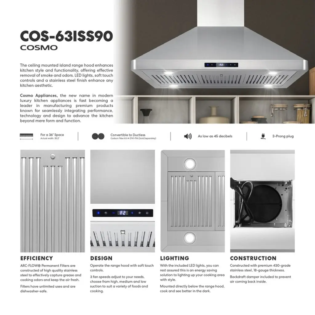 Cosmo Cos-63iss90 36 In. Lumin Collection 380 Cfm Ducted Island Range Hood, Soft Touch Controls, Led Lights, Stainless Steel
