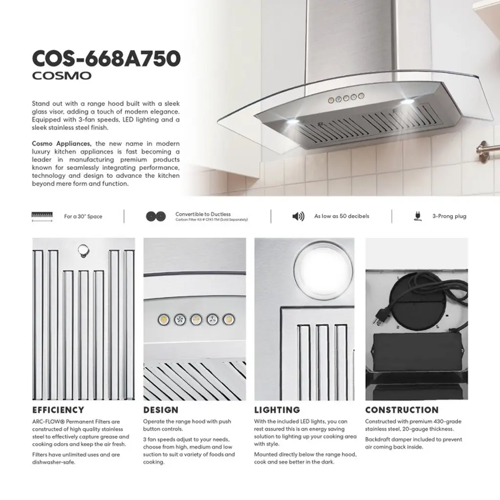 Elevate your kitchen decor to new heights. Cosmo’s COS-668A750 wall mount range hood features a stainless steel body with a tempered glass visor. Heavy duty stainless steel permanent filters are dishwasher safe for easy clean-up. 380 cu. ft. per minute suction traps smoke and fumes from disturbing your home. The glass visor captures smoke and steam, ensuring it doesn’t escape into your home. Energy efficient LED lighting is included to illuminate your cooktop. Featuring touch controls and a 3-prong power plug for easy use. Part of the Vista Collection, bringing enhanced functionality and design, offering a well-rounded option for those looking for more convenience and style in an appliance. • The Vista Collection brings enhanced functionality and design, offering a well-rounded option for those looking for more convenience and style in an appliance • Push button controls make operating our wall mount range hood easy to control with just a tap of a finger • 3 fan speeds to adjust to your needs, choose from high, medium and low suction to suit a variety of foods and cooking • Noise level as low as 50 dB on lowest fan speed with rigid ducting (sold separately) under optimal conditions; range hood comes with flexible ducting for convenient installation • Energy efficient 2-Watt LED lights helps illuminate your cooktop surface for added visibility, mounted directly below the range hood, cook and see better in the dark • Cosmo ARC-Flow permanent filters are constructed of high quality stainless steel to effectively capture grease and cooking odors and keep the air clean, our ARC-Flow permanent filters are dishwasher-safe and extremely durable, no need to replace these filters, simply drop them in the dishwasher for easy maintenance • Range hood can be converted to recirculating/ductless operation with optional purchase of Carbon Filter Kit CFK1-TM (sold separately) • 2 years limited warranty, trust our wall mount range hood to deliver years of trouble-free use • Wall mount range hood with telescoping chimney makes it suitable for ceilings 7.5 ft. to 8.5 ft. in height • Wall mount range hood is made of premium 430 grade stainless steel, 20-Gauge thickness • 3-prong power plug • ETL Listed: ETL Listed products demonstrate compliance to North American safety standards published by relevant NRTLs (Nationally Recognized Testing Laboratories)