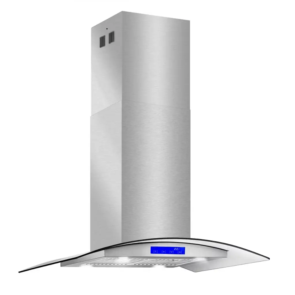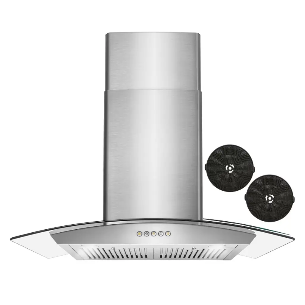 Cosmo presents this beautiful designer Italian-style ductless island range hood with a clear glass visor. Our carbon filter kit is included for ductless and recirculating installation. Made with the latest designs from Italy, architects and interior designers use our range hoods in high rises and luxury condominiums projects where style and functionality matter. Premium brushed stainless steel matches seamlessly with existing kitchen appliances for a modern upscale look. It features a 380 CFM high-efficiency motor with premium stainless steel baffle filters to trap grease and oil. This newly designed range hood is both energy efficient and quiet utilizing high lumen LED lighting for year-round cost savings. Trust Cosmo for your next kitchen appliance for premium quality at factory-direct prices. Part of the Lumin Collection bringing enhanced functionality and design, offering a well-rounded option for those looking for more convenience and style in an appliance. • The Lumin Collection brings enhanced functionality and design, offering a well-rounded option for those looking for more convenience and style in an appliance • Ductless island mount range hood with ultra-quiet design and glass visor, carbon filter kit is included for ductless and recirculating installation • Easy-to-use digital touch controls with timer and clock, control everything with a tap of a finger • Choose from 3 fan speeds from high, medium, and low to suit a variety of cooking styles • Ductless range hood features 380 CFM of suction, cook with the confidence you'll always have enough kitchen ventilation • Noise level as low as 45 dB on lowest fan speed with rigid ducting (sold separately) under optimal conditions • Four LED lights mounted below the range hood helps illuminate the cooktop surface • Quick-release, stainless steel baffle filters for hassle-free maintenance, these filters capture oil and grease pulled up from your cooktop and away from your home and family, protect your health by exhausting unwanted fumes and odors • Carbon filter kit lasts up to 6 months depending on use, replacements available for optimum performance (purchase part # CFK1-TM) • Ductless island mount range hood exhaust opening uses 6 in. round duct; backdraft damper is included to prevent air coming back inside • Premium 430 grade stainless steel, 20-Gauge • Carbon filter kit installs onto each side of the motor, simply align and twist to lock into place to convert into a ductless range hood • 2 years limited parts warranty, trust our island mount range hood to deliver years of trouble-free use