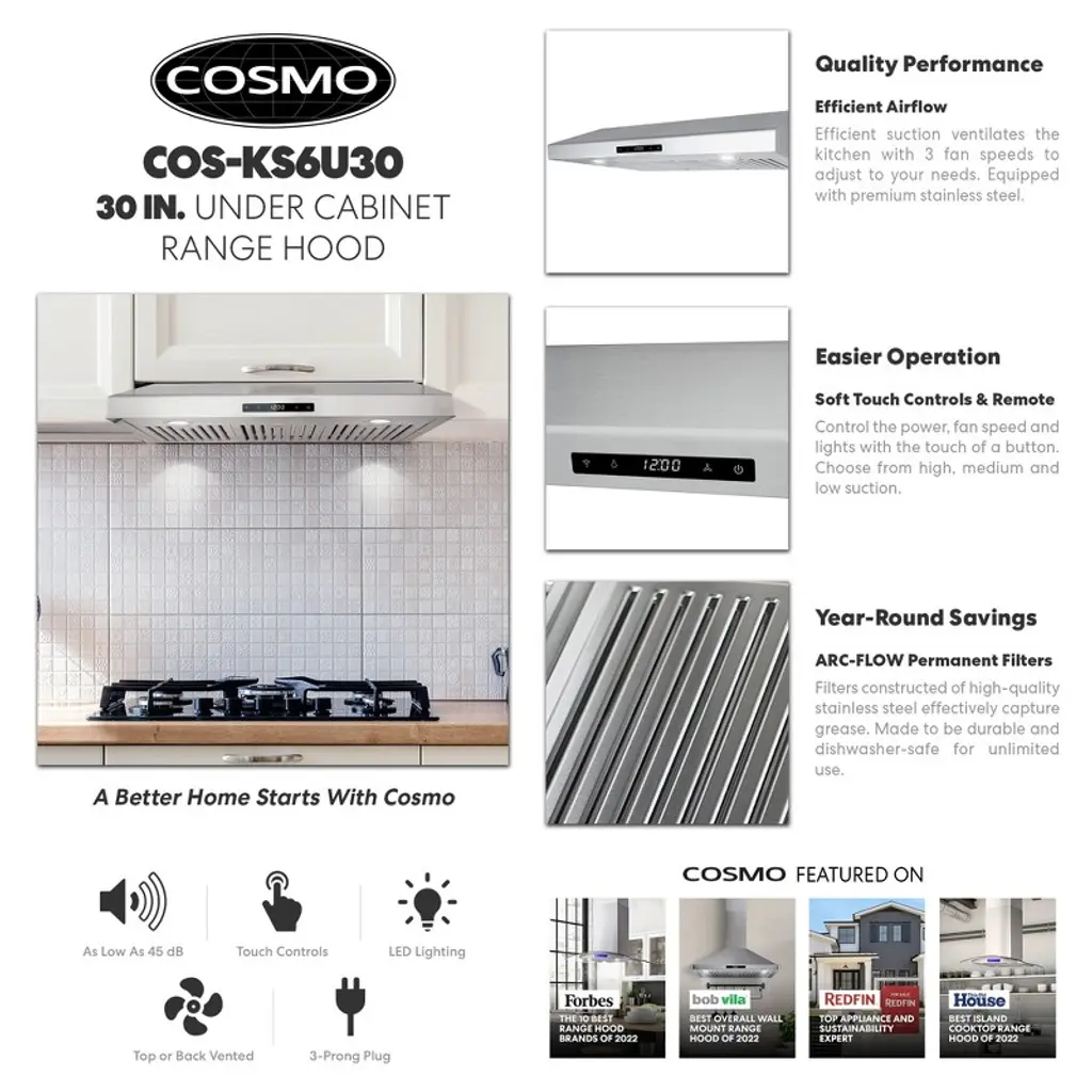 Cosmo Cos-ks6u30 30 In. Haven Collection 500 Cfm Ducted Under Cabinet Range Hood, Touch Controls, Led Lights, Stainless Steel