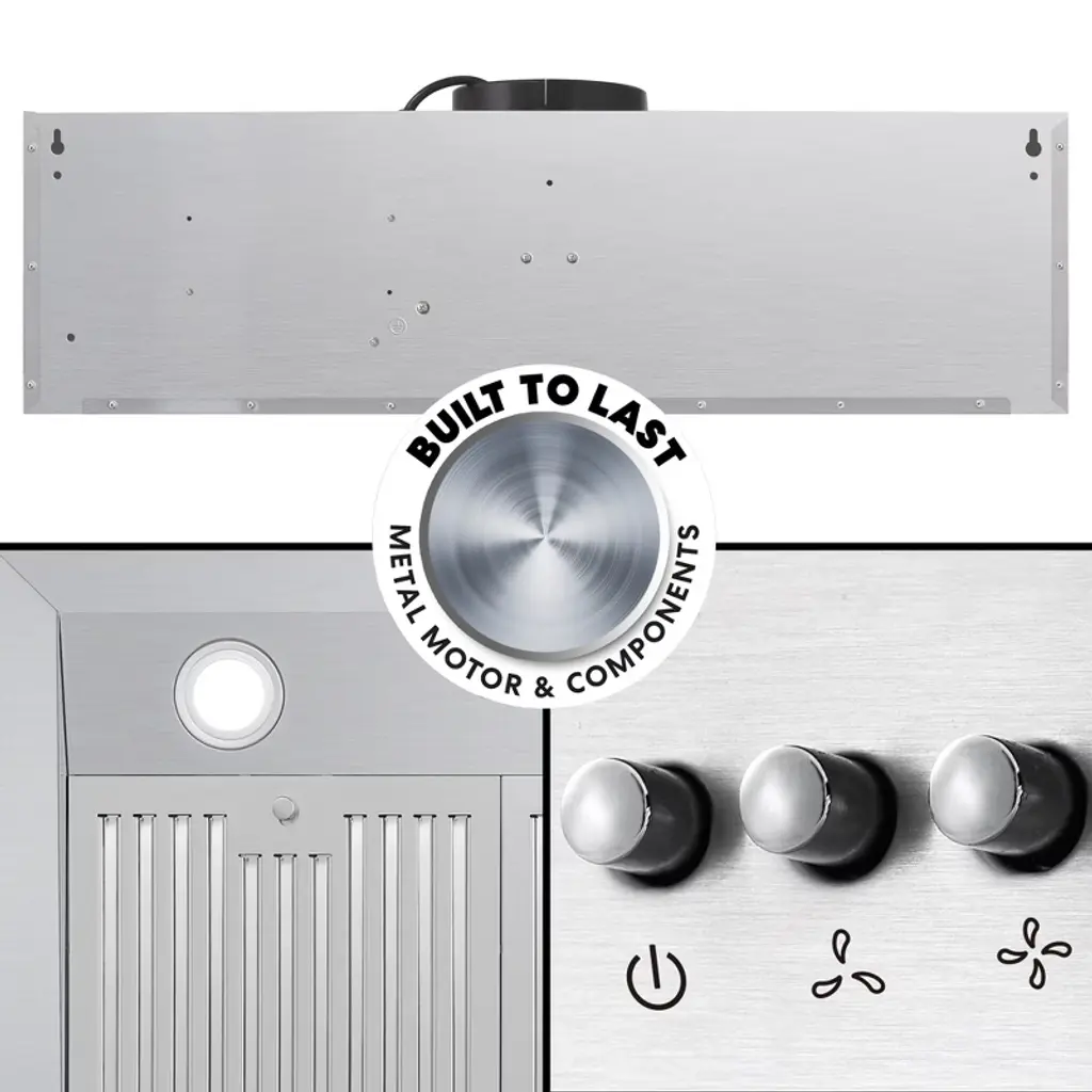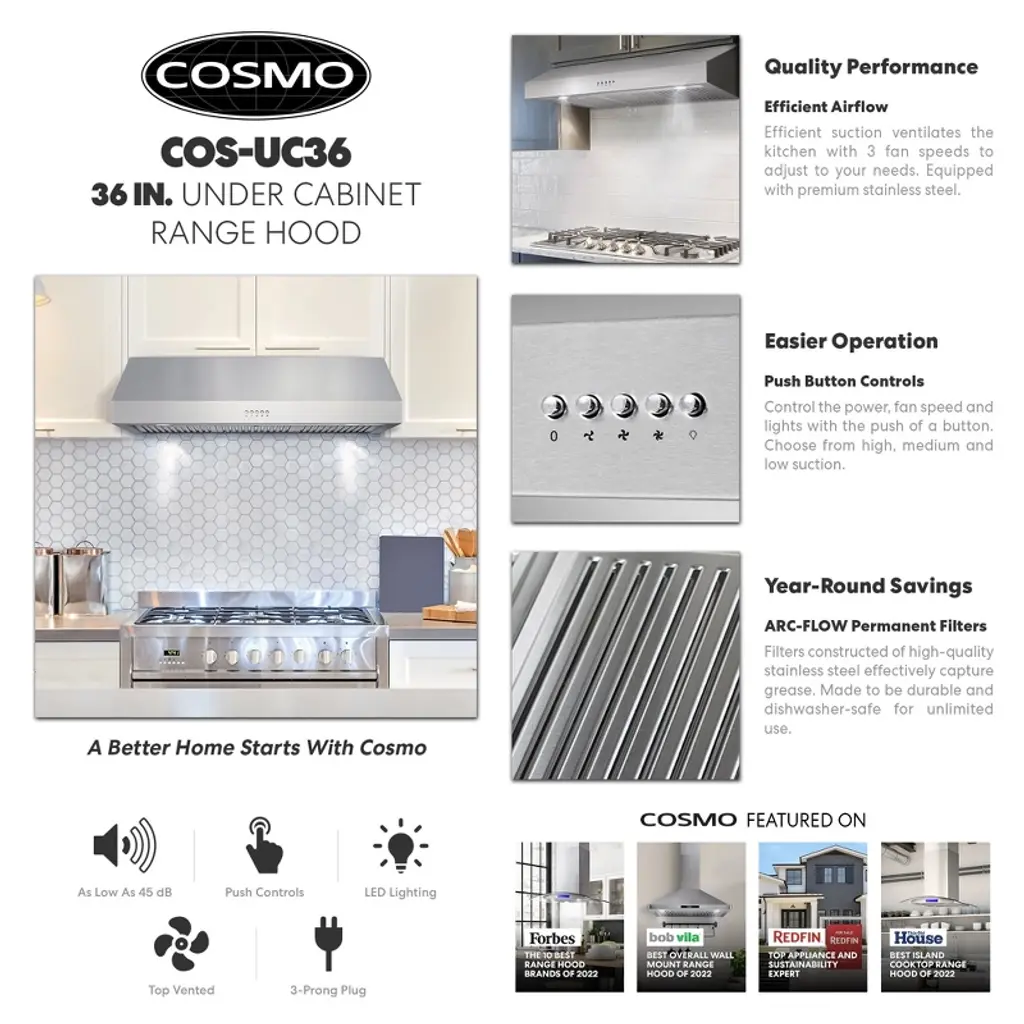 Made with professional styling, Cosmo's UC36 under cabinet range hood has a modern and minimalist design. 3 fan speeds, up to 380 CFM, is available at your fingertips for high-powered kitchen ventilation. Energy efficient LEDs can be enabled with the simple push-button controls. Clean up is a breeze with easily removable, permanent, dishwasher safe stainless steel filters. A 120V 3-prong power cord is included for easy installation. Cosmo appliances put professional quality in your home for factory direct prices. Part of the Haven Collection bringing enhanced functionality and design, offering a well-rounded option for those looking for more convenience and style in an appliance. • The Haven Collection brings enhanced functionality and design, offering a well-rounded option for those looking for more convenience and style in an appliance • Ultra-quiet design with under cabinet range hood mounting • Easy electronic push button controls • 3 fan speeds to adjust to your needs, choose from high, medium and low suction to suit a variety of foods and cooking • Noise level as low as 45 dB on lowest fan speed with rigid ducting (sold separately) under optimal conditions; range hood comes with flexible ducting for convenient installation • Two bright white LED lights help illuminate the cooktop surface for added visibility • Cosmo ARC FLOW permanent filters are constructed of high-quality stainless steel to effectively capture grease and cooking odors and keep the air clean. Our ARC FLOW permanent filters are dishwasher-safe and extremely durable • 2-year limited warranty, trust our under cabinet range hood will provide years of trouble-free use • Range hood exhaust is 6 in. round duct, a backdraft damper is included to prevent air from coming back inside • Under cabinet range hood is made of premium 430 grade stainless steel, 20-Gauge thickness • 3-prong 120-Volt power cord included for easy installation • ETL Listed: ETL Listed products demonstrate compliance to North American safety standards published by relevant NRTLs (Nationally Recognized Testing Laboratories)