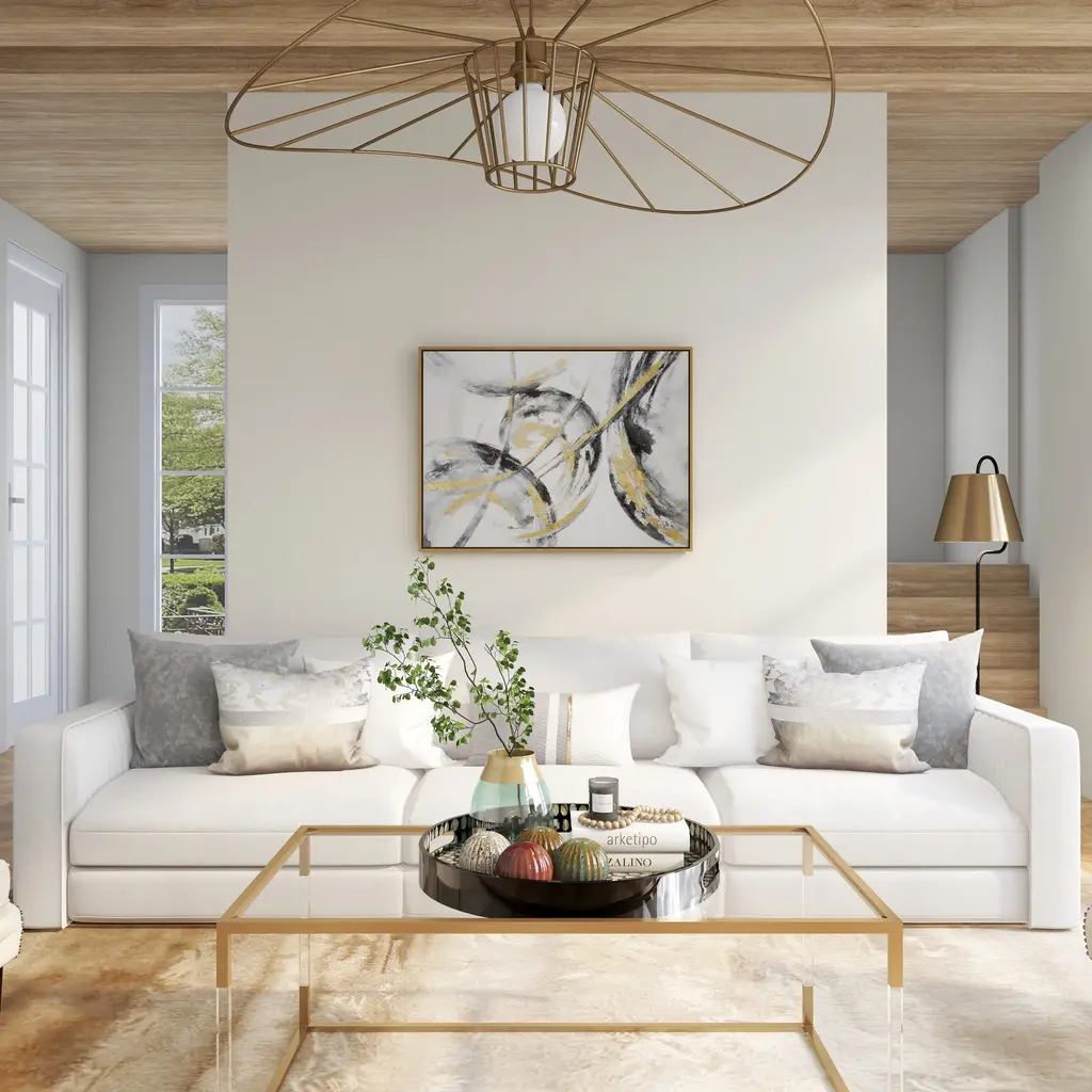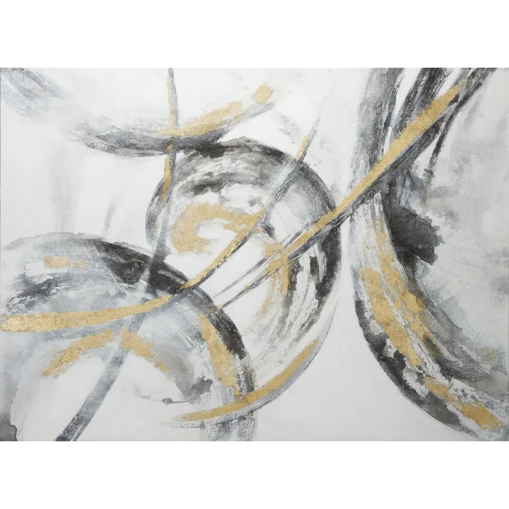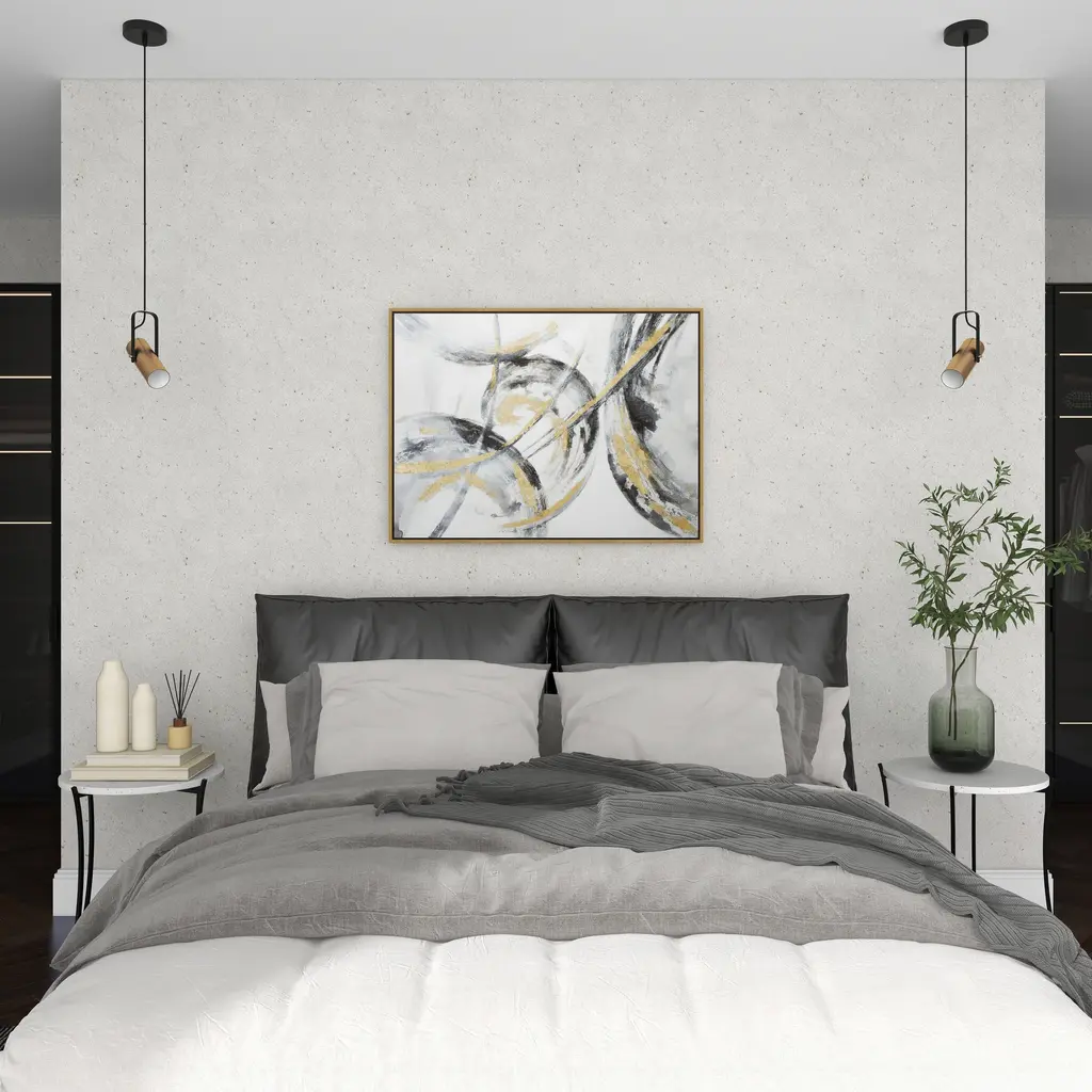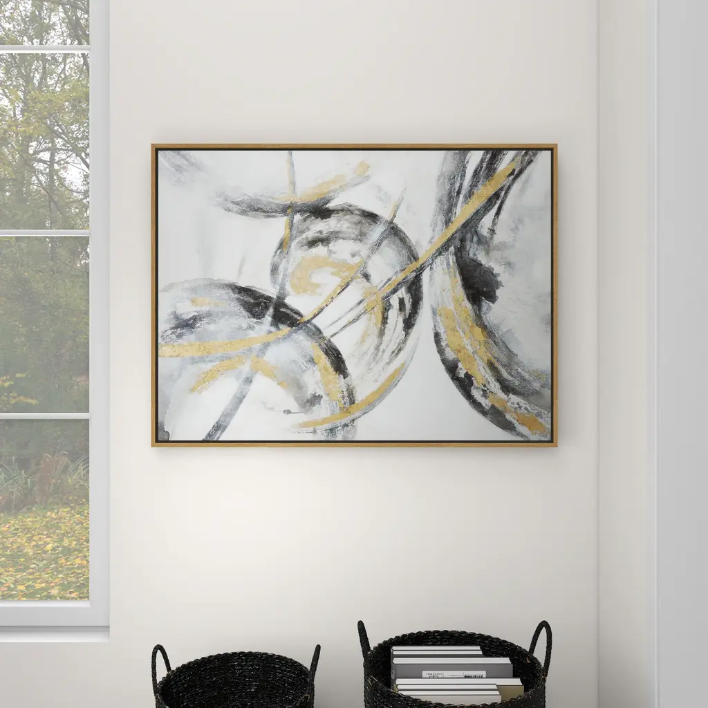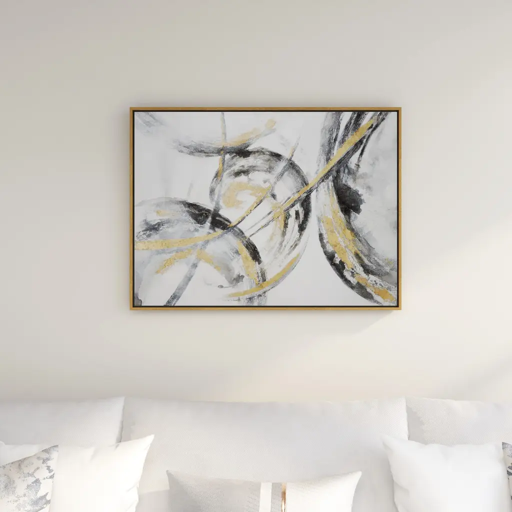 This wall art exude natural beauty and sophistication in both color and composition. Showcase your personality and turn your walls into an art gallery with this impressive wall art. Bring contemporary art to your home space with this framed canvas wall decor displayed on your living room or bedroom walls. This item ships in 1 carton. Water color and acrylic paint over a fabric canvas housed in a textured, metallic gold Chinese fir wood frame with a ½" matte black frame between the two. Can be hung horizontally using the sawtooths on the back; nails and screws not included. Suitable for indoor use only. This is a single framed wall art. Contemporary style.