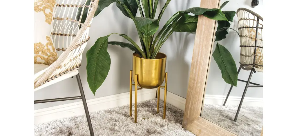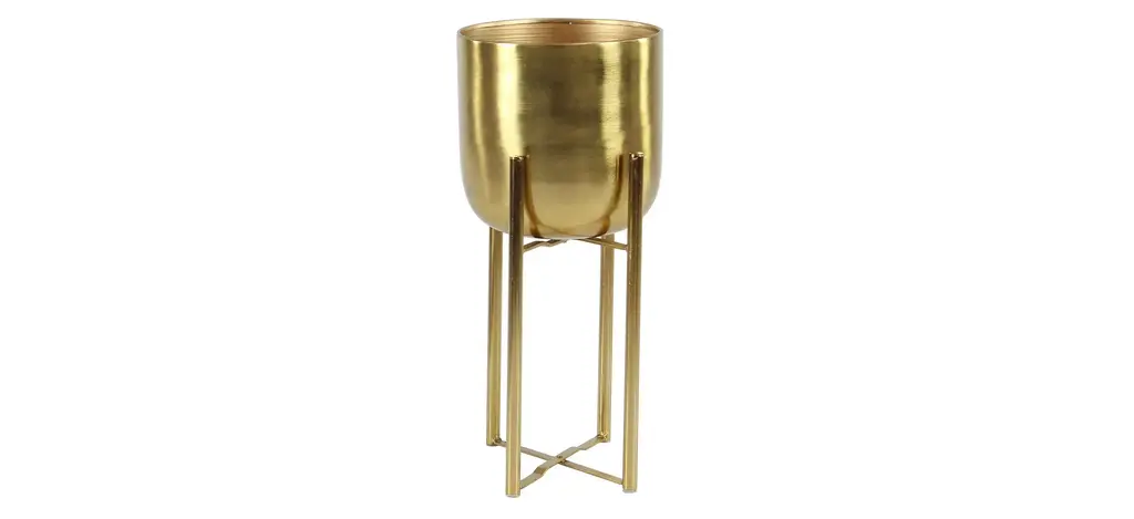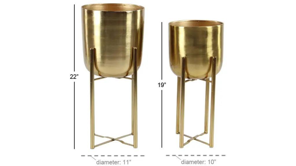 Give some gilded love to your home with this CosmoLiving Handsome Planter Set of 2. Completely iron construction means it is lightweight, durable, and safe from the elements when placed outside! Deep, round planter bodies will beautifully display your patio plants, as the tall height of the frames will let the leaves cascade without crowding. Neutral yet stunning metallic gold finishes complement any pattern or color palette while adding some pizazz to your indoor or outdoor sanctuary. Indoor and outdoor friendly, so display your favorite greenery at your front door, living room, bathroom, bedroom, patio, or deck! Features clear rubber stoppers beneath each leg to prevent scuffing and sliding. Wipe clean with a dry cloth. No drainage holes.