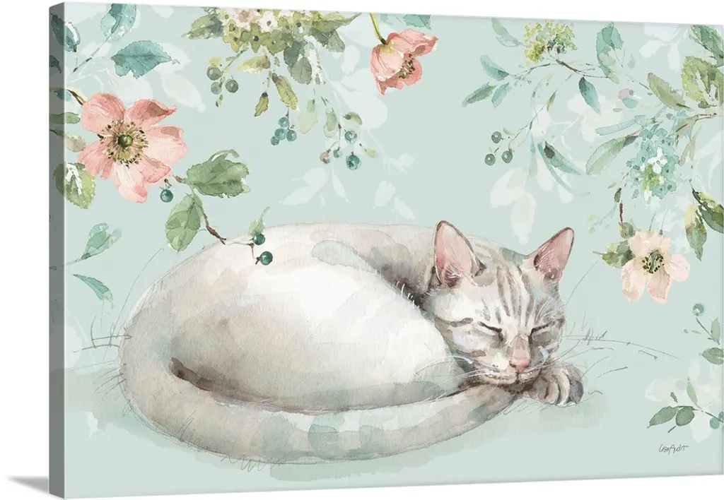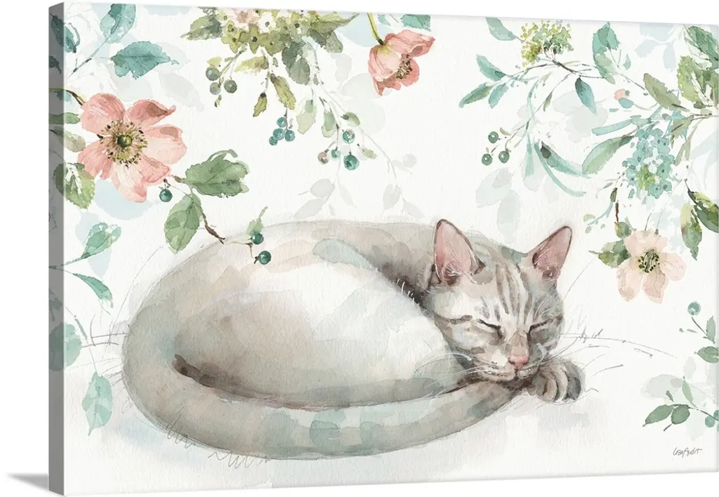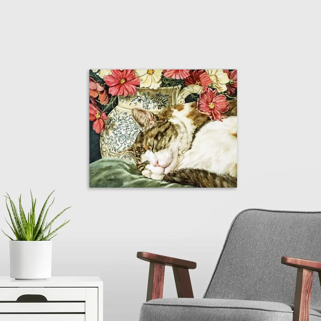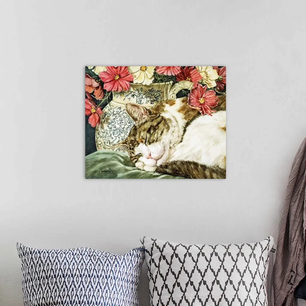 A cat sleeping on a pillow next to a vase of flowers.