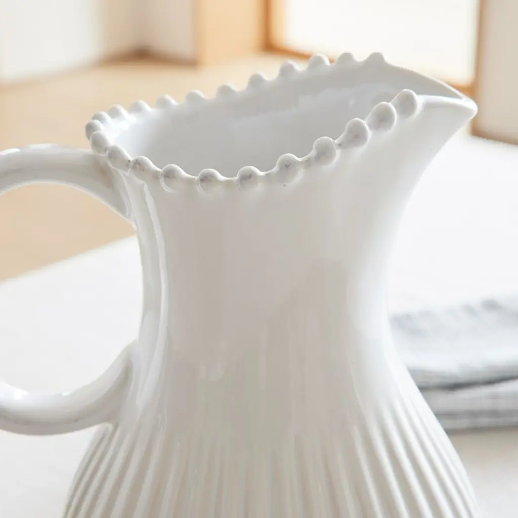 The Pearl White Pitcher is inspired by Victorian era ceramics, with rounded shapes and a beaded texture. Made in Portugal, the crisp white glaze puts a modern spin on this classic shape and is perfect for serving iced tea, lemonade or any drink of your choice.