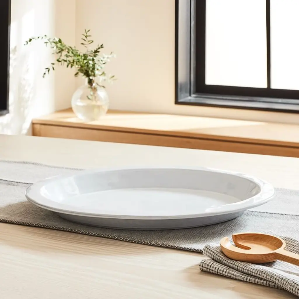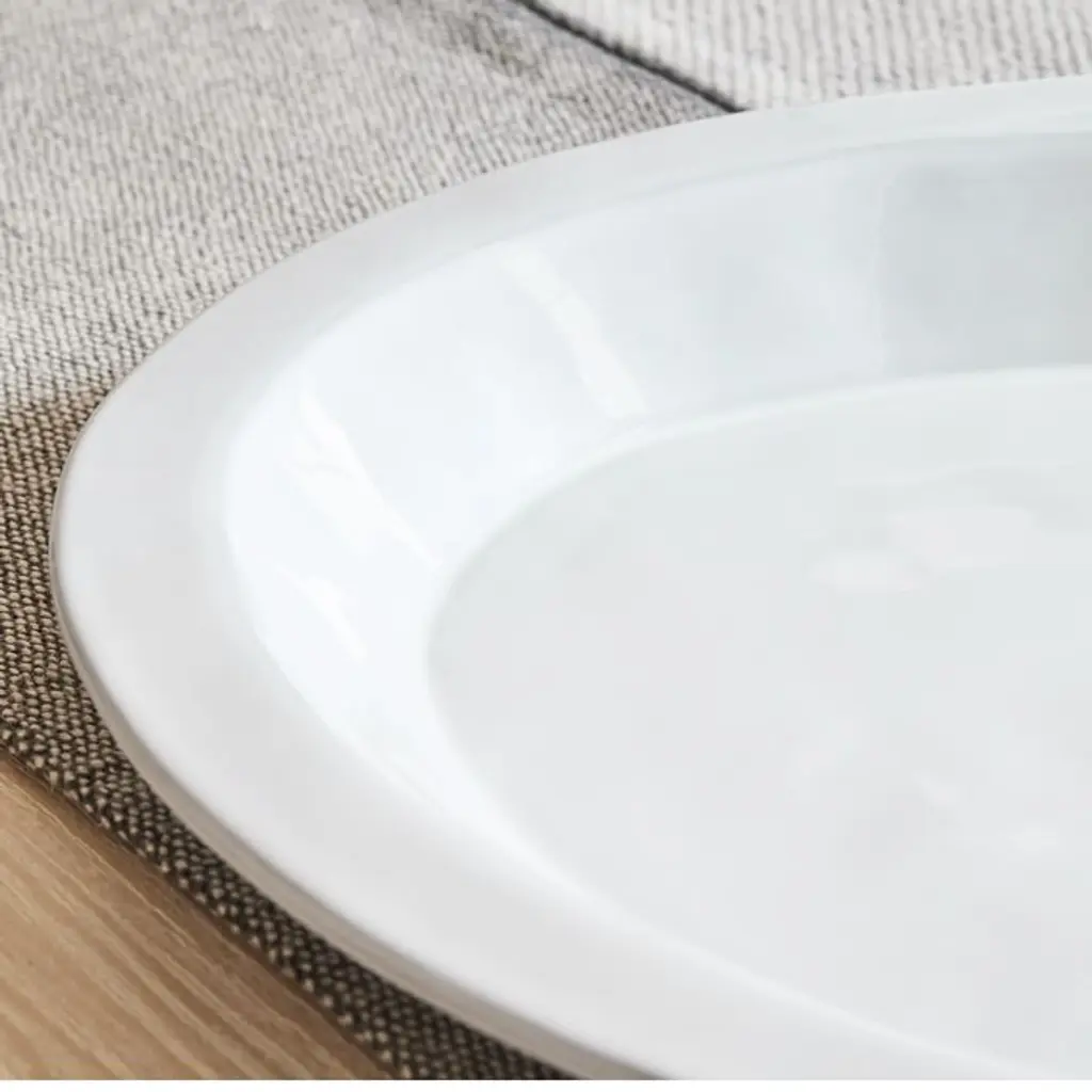 Made from surplus factory clay at the Costa Nova factory in Portugal, our Plano Oval Platter turns recycled materials into distinctly shaped dinnerware. The socially conscious and functional end result is a lovely addition to any kitchen—not to mention dishwasher and microwave safe. Perfect for serving your favorite meals or desserts. 16"w x 12"d x 1.5"h. Stoneware in a White/Gray finish. Sold individually. Made in Portugal.
