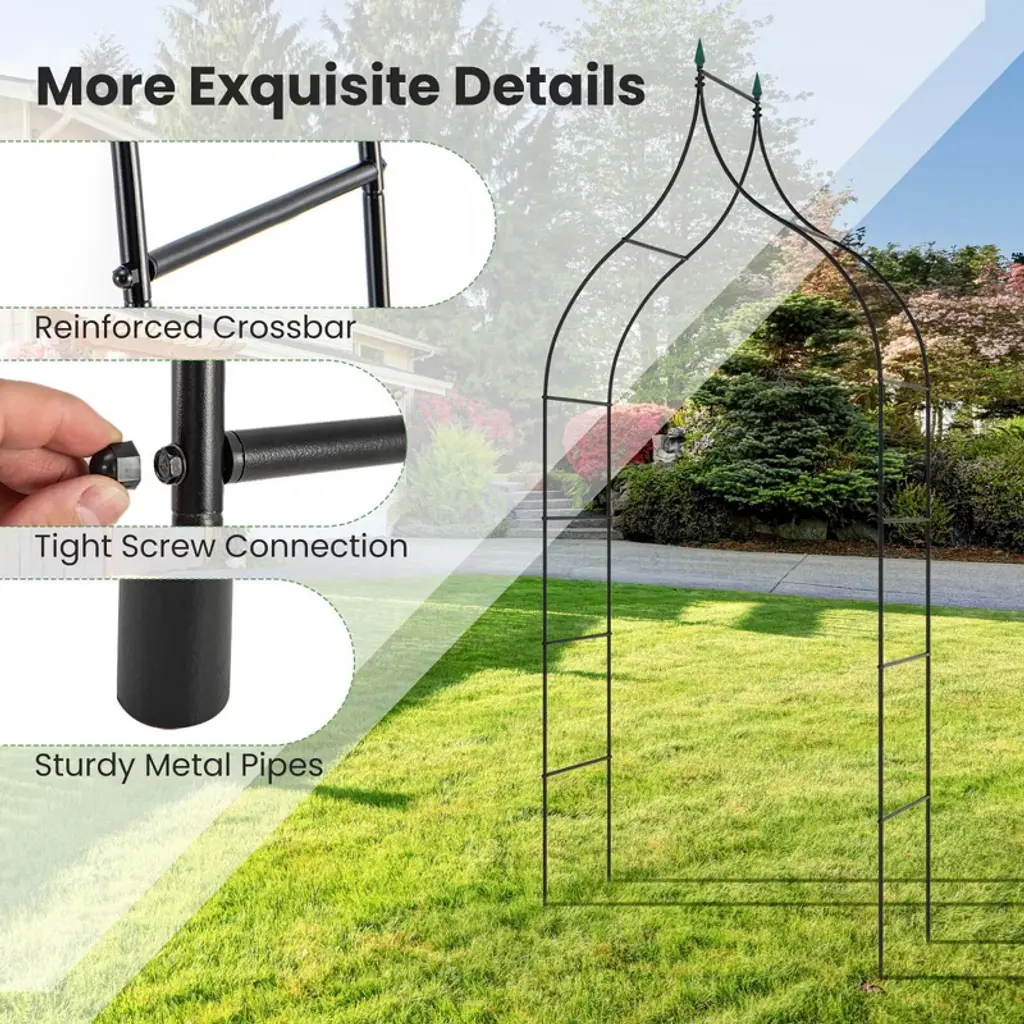 Looking for a modern and stylish touch for your outdoor space? This garden arbor comes with delicate curves and gothic inspired spire, adding elegance to your outdoor decor. Featuring multiple side crossbars, this trellis pergola offers ample space for your creativity. Whether showcasing plants, lights, balloons, or flowers, you can design your own arbor to suit any occasion. Additionally, this metal garden arch is perfect for both indoor or outdoor use, as a pergola, wedding arch, or backdrop stand. Crafted from sturdy materials with reinforced connections, this archway offers durability and stability. Hence, our garden arbor is what you want.FeaturesDelicate curves and gothic inspired spire offer a touch of outdoor beauty Multiple side crossbars provide ample decoration space Can be decorated with plants, lights, balloons, or flowers Versatile use indoors or outdoors for various settings Sturdy construction with sturdy materials and reinforced connections Easy assembly with clear instructions for effortless setup Dimensions of 4.1 x 1.3 x 9.5 ft Stylish design that elevates your outdoor decor effortlesslyColor: Black Material: Metal Overall Dimensions: 4.1 x 1.3 x 9.5 ft (L x W x H) Net Weight: 8.5/17 lbs Package Includes: 1/2 x Metal Garden Arbor 1 x User’s Manual