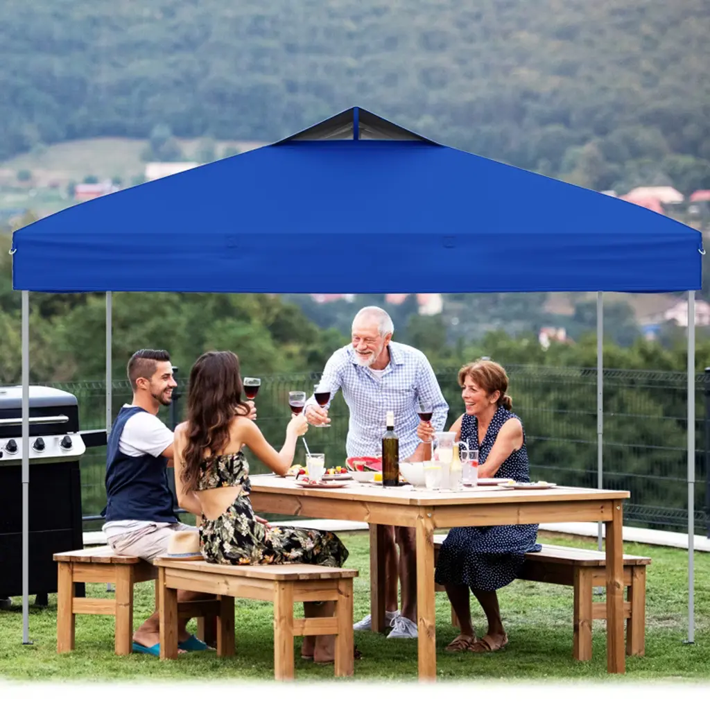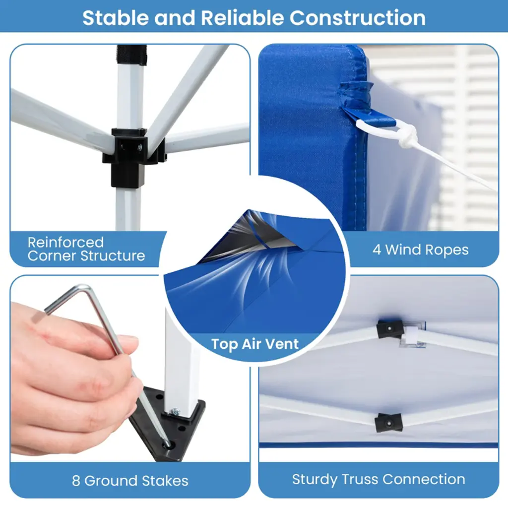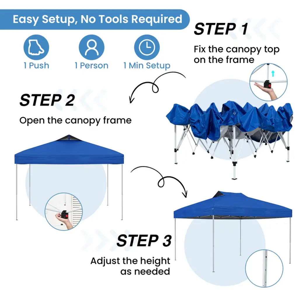 Elevate Your Outdoor Experience to New Heights! Our pop up canopy tent measures 10 x 10 x 8.4-9 ft (L x W x H), complete with a 3-level adjustable height, perfect for various outdoor activities such as commercial events, camping, festivals, tailgating, and backyard gatherings. It features an innovative one-push locking mechanism, which allows for quick and easy setup and takedown, seamlessly operated with one hand and in seconds. When not in use, you can easily collapse it and store it in the portable carrying bag, making storage a breeze. For enhanced stability and security, the canopy is equipped with 8 metal stakes and 4 wind ropes, complete with an air vent on the top to reduce wind pressure, ensuring a secure and sheltered outdoor space. More than that, the canopy is crafted of premium oxford fabric with silver coating, offering superior sun and rain protection, built to last (Note: Please avoid using it in heavy rain or strong windy days). Our canopy tent is your go-to solution for all your outdoor shelter requirements.FeaturesThe center lock system makes assembly a breeze, 1 push, 1 person, 1 min setup Equipped with a pop-up structure, allow for easy setup, no tools required The oxford canopy ensures fade resistance, drizzle resistance, and tear resistance The canopy with silver coating offers superior UPF50+ sun protection Equipped with sturdy truss connections, enhance strength, prevent deforming Equipped with metal stakes and wind ropes to firmly secure the tent Equipped with an air vent for improved airflow and reduced wind pressure Includes a portable storage bag, effortless to transport anywhere you go Ideal for various outdoor activities, markets, sporting events, picnics, beach outings Equipped with a 3-level adjustable height accommodate personal preferences Color: Blue/Pink/Gray/Navy/White Material: Oxford Fabric, Silver Coating, Metal Product Dimensions: 10 x 10 x 8.4-9 ft(L x W x H) 3 Adjustable Heights: 8.4/8.7/9 ft Ground Clearance: 5/5.4/5.7 ft Carrying Bag Size: 4 x 0.7 x 0.7 ft (L x W x H) Net Weight: 32 lbs Package Includes: 1 x Canopy 1 x Frame 1 x Carrying Bag 4 x Wind Ropes 8 x Ground Stakes 1 x User’s Manual