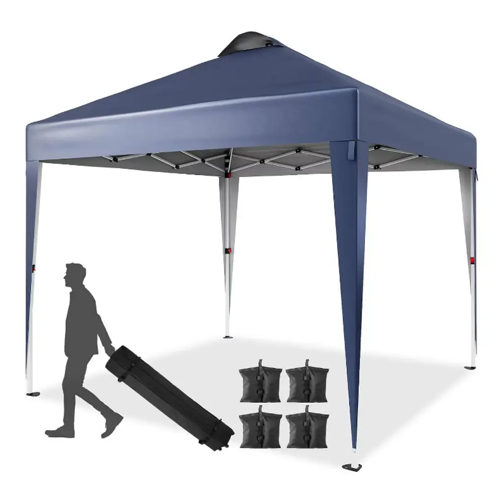 Are you looking for a stable and sturdy canopy to provide shelter for your outdoor activities? Our 10' x 10' folding canopy tent will be your best choice! The canopy is made of 300D silver-coated oxford cloth, which can protect you from the sun and rain. The powder-coated steel frame is sturdy and not easy to rust to withstand long-term use. With a shade area of 100 square feet, this folding canopy is suitable for picnics, parties, trade shows and other outdoor activities. It's worth mentioning that this canopy has 3 height settings to choose from, and the no-pinch buttons allow you to easily lock the legs at desired height without damaging fingers. In addition, equipped with a wheeled storage bag, this folding canopy can be carried to the beach, park, tailgate, etc. Features300D silver coated oxford cloth for water and sun protection Powder coated steel frame for high stability and rust resistance 3 adjustable height settings to meet different needs Pinch-proof buttons for easy adjustment without hurting fingers Comes with guy ropes and ground stakes for added stability A wheeled storage bag for easy transportation and carrying Ideal for parties, picnics, exhibitions or other outdoor activities Including a clear user's manual for easy set-upColor:White Blue Grey Material: 300D Oxford Cloth + Steel Product Dimensions: 10' x 10' x 10'-10.5'-11' (L x W x H) Carry Bag Dimensions: 65''x 9''x 9'' (L x W x H) Net Weight: 46.5 lbs Package includes: 1 x Canopy Tent 1 x Wheeled Storage Bag 1 x Instruction 4 x Guy Rope 4 x Big Stake 4 x Small Stake