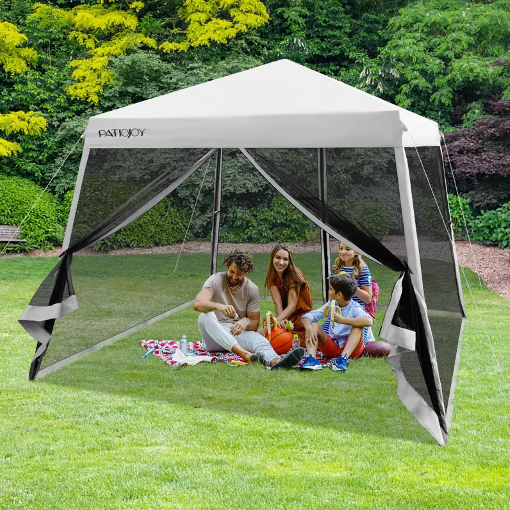 Enjoy Outdoor Leisure Time with Your Family & Friends! Our instant pop-up canopy tent measures 10 x 10 x 7.8-8.4 ft (L x W x H), providing a large shading area for various outdoor activities, such as backyard family gatherings, lawn BBQ parties, camping, picnics, beach parties, and more. Thanks to the easy center push mechanism, the canopy tent can be easily set up and taken down with no tools required. And the telescoping legs offer 3 height levels (7.8 ft, 8.1 ft, 8.4 ft) for different occasions according to your needs. The canopy is crafted with sturdy oxford fabric and coated with premium silver, which features excellent UPF 50+ sun protection and rain resistance. And there exist mesh sidewalls on 4 sides, allowing you to enjoy the beautiful scenery while keeping out the bugs. In addition, the frame is constructed of powder-coated steel, which is anti-rust and sturdy, ensuring long-term outdoor use. And we also provide extra 4 wind ropes, 8 metal stakes, 4 sandbags, and 4 plastic pegs with stake holes to firmly fix the canopy on the ground, adding more stability and safety. Other than that, our roller bag is designed with 2 wheels for easy movement and a carrying bag for easy storage, so you can easily take the canopy tent to the beach, campsite, lawn, park, or anywhere you want.FeaturesEasy and quick to set up and take down, locked by an easy center push mechanism Features 3-level adjustable height(7.8 ft, 8.1 ft, 8.4 ft), easy to adjust by pushing the button Made of premium oxford fabric, waterproof, sturdy, wear & tear-resistant Features silver coatings, helping block 99% of sunlight, UPF 50+ sun protection The mesh sidewalls provide enough airflow while keeping bugs out The mesh sidewalls can be detached and feature 2 smooth zippers for easy access Supported by a heavy-duty powder-coated steel frame, rustproof, sturdy With wind ropes and stakes fixation, footpads and stake holes, sandbags, keep stable The slanted legs form a pyramid shape, adding stability while creating more shade Comes with a carrying bag and rolling wheels, easy to store and transport Features an extra storage pocket on the carrying bag for storing small itemsColor: White/Blue/Grey Material: Oxford Fabric, Silver Coating, Metal Overall Dimensions: 10 x 10 x 7.8-8.4 ft (L x W x H) Adjustable Height: 7.8 ft/8.1 ft/8.4 ft Entrance Height: 5.2 ft/5.5 ft/5.8 ft Carrying Bag Size: 0.7 x 0.8 x 3.8 ft (L x W x H) Net Weight: 28 lbs Package Includes: 1 x Outdoor Instant Canopy 1 x Carrying Bag 4 x Wind Rope 8 x Stake 4 x Sandbag 1 x User's Manual